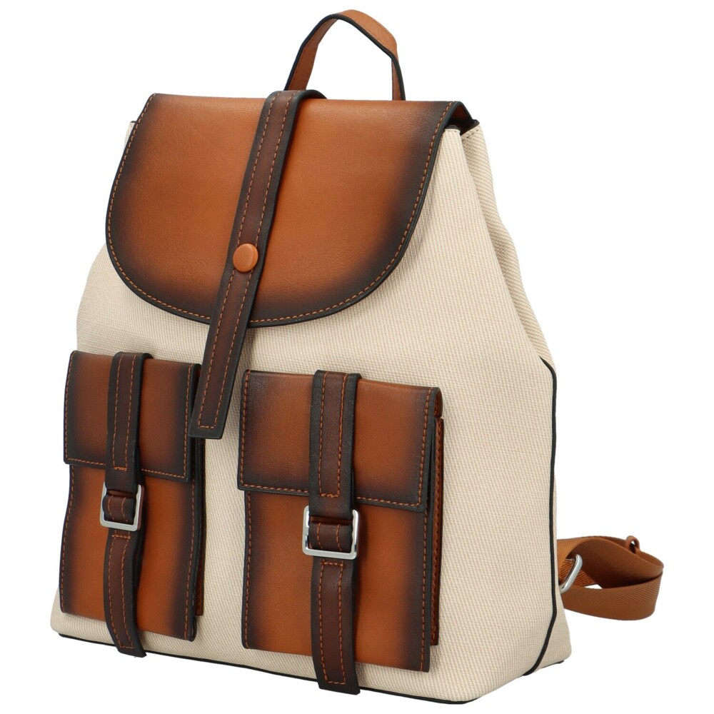 Designový kousek, který vás zaujme svou přední stranou na které jsou dvě hnědé menší kapsy, zajištěné přezkou a koženková klopa ve stejné barvě kapes. Po otevření klopy na magnetický druk nabízí batoh hlavní kapsu na zip. Vnitřek batohu je světlý s několika přihrádkami. Zadní díl disponuje menší kapsičkou na zip. Popruhy se dají regulovat a jsou z části textilní a z části koženkové, nošení tak bude radost. Ucho je pevné, pro nošení v ruce či zavěšení. Objednejte ještě dnes a vyzkoušejte, vrátit jej můžete až do 30 dnů!