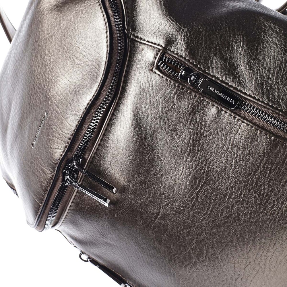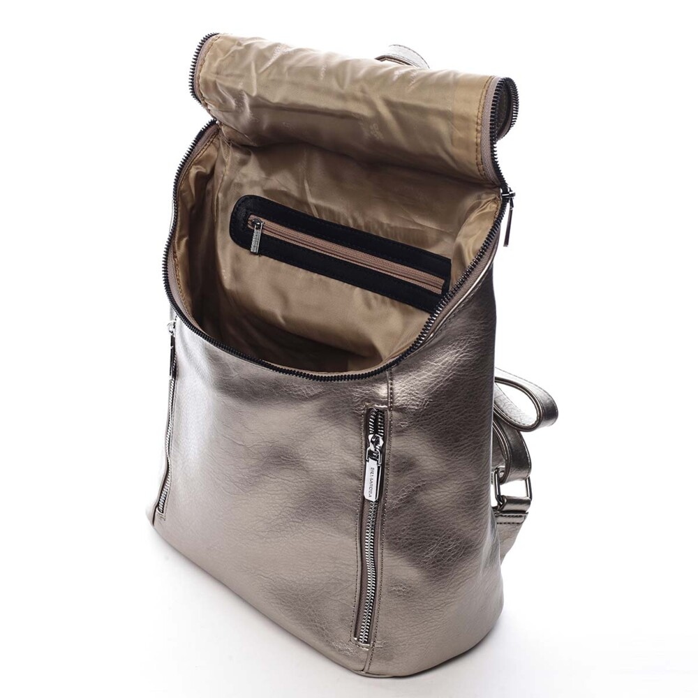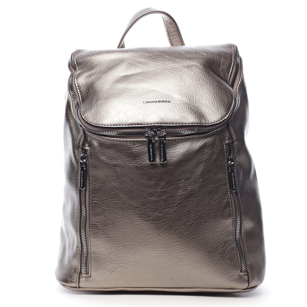 Dámský, větší, městský batoh od značky Silvia Rosa. S tímto moderním bronzově stříbrným kouskem v davu nezapadnete! Objednejte ještě dnes a vyzkoušejte, vrátit ji můžete až za 30 dnů! Styl batohu rozhodně nechybí. Otevírá se jakoby klopou se zipem, který má dva jezdce, uvnitř jsou klasické kapsičky na telefon, klíče a cennosti. Přední strana zaujme dvěma kapsami, taktéž se zipy. Chybět Vám nebude ani kapsa se zipem na zadní straně batohu. Celkově je batoh měkký, jeho dno je ale pevnější.