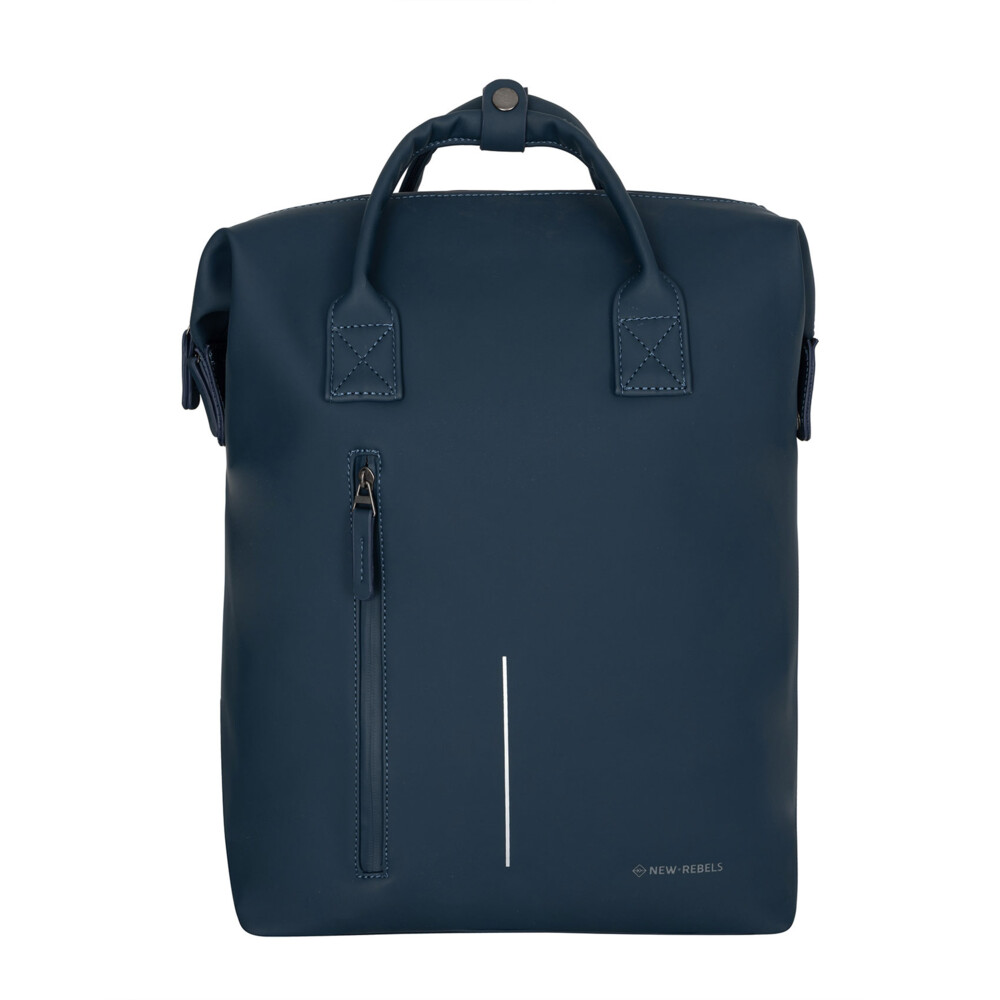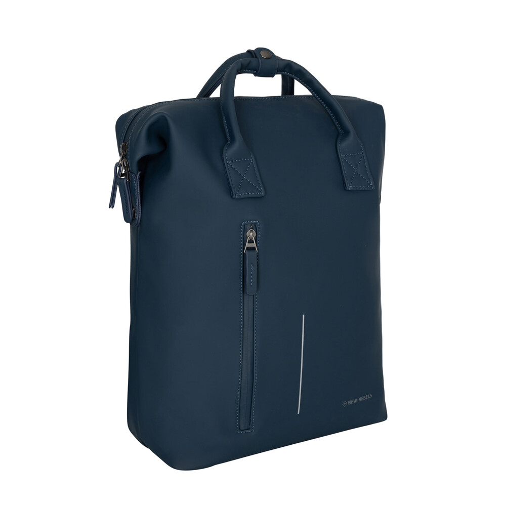 Objednejte ještě dnes a vyzkoušejte, vrátit jej můžete až do 30 dnů! Velmi atraktivní moderní batoh značky New Rebels je praktickým módním dámským doplňkem. Tmavě modrý hladký větší batoh z umělé kůže má polstrovné popruhy i záda i se zádovým bodovým systémem. Zároveň je na zadní straně batohu pás, díky kterému jej lze upevnit na madlo kufru. Využít ho můžete tedy i jako cestovní zavazadlo a ne jen ve městě, ve škole nebo v práci. Na přední straně najdete svislou kapsičku se zipem. Hlavní prostor se otevírá pomocí zipu a uvnitř je lehce polstrovaná přihrádka na tablet či menší notebook. Samozřejmostí jsou malé kapsičky na telefon či kosmetiku. Zároveň musíme zmínit jeho voděodolnost a to i se zipy, které jsou pogumované.