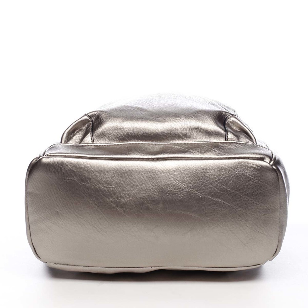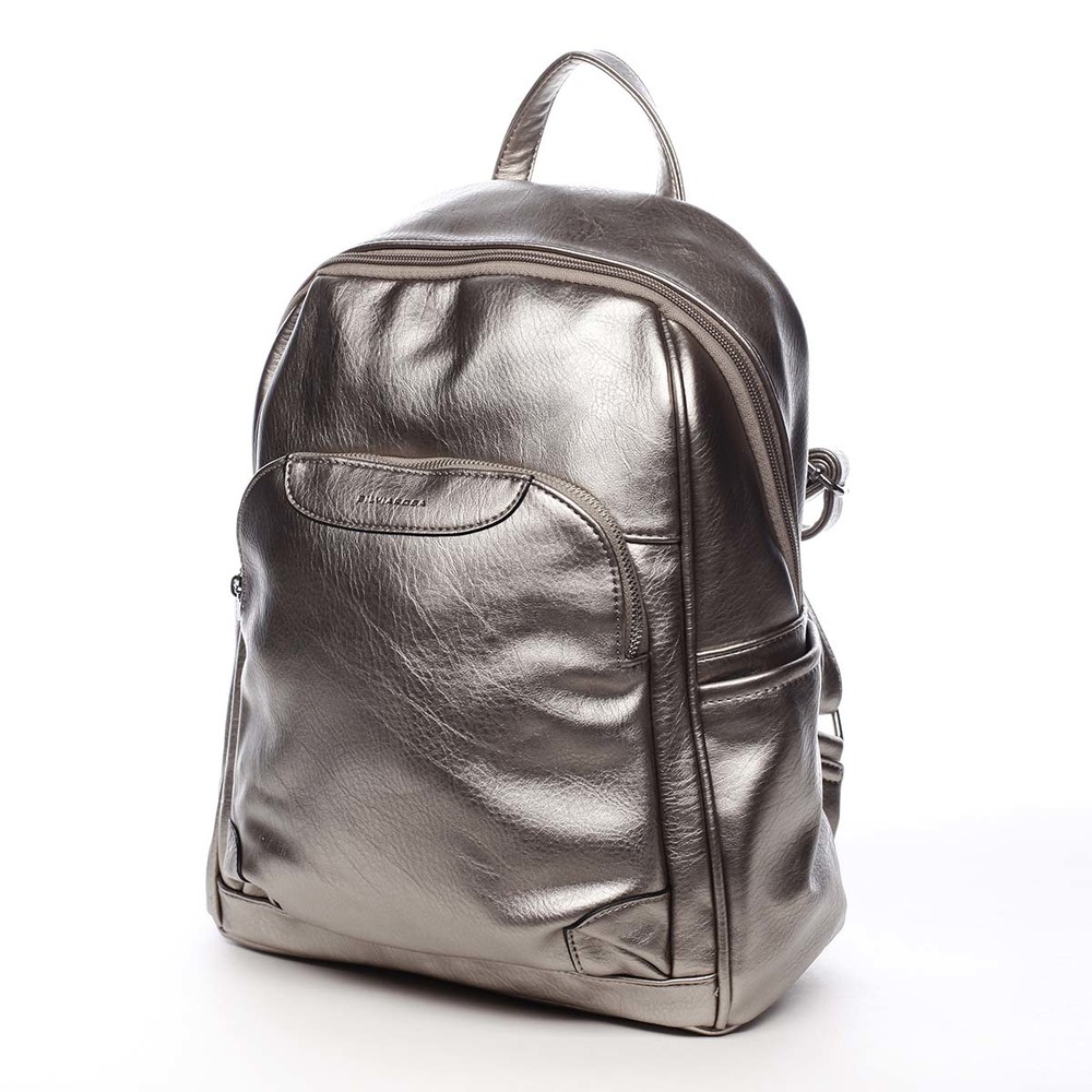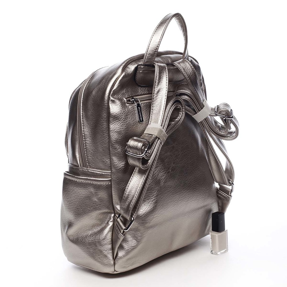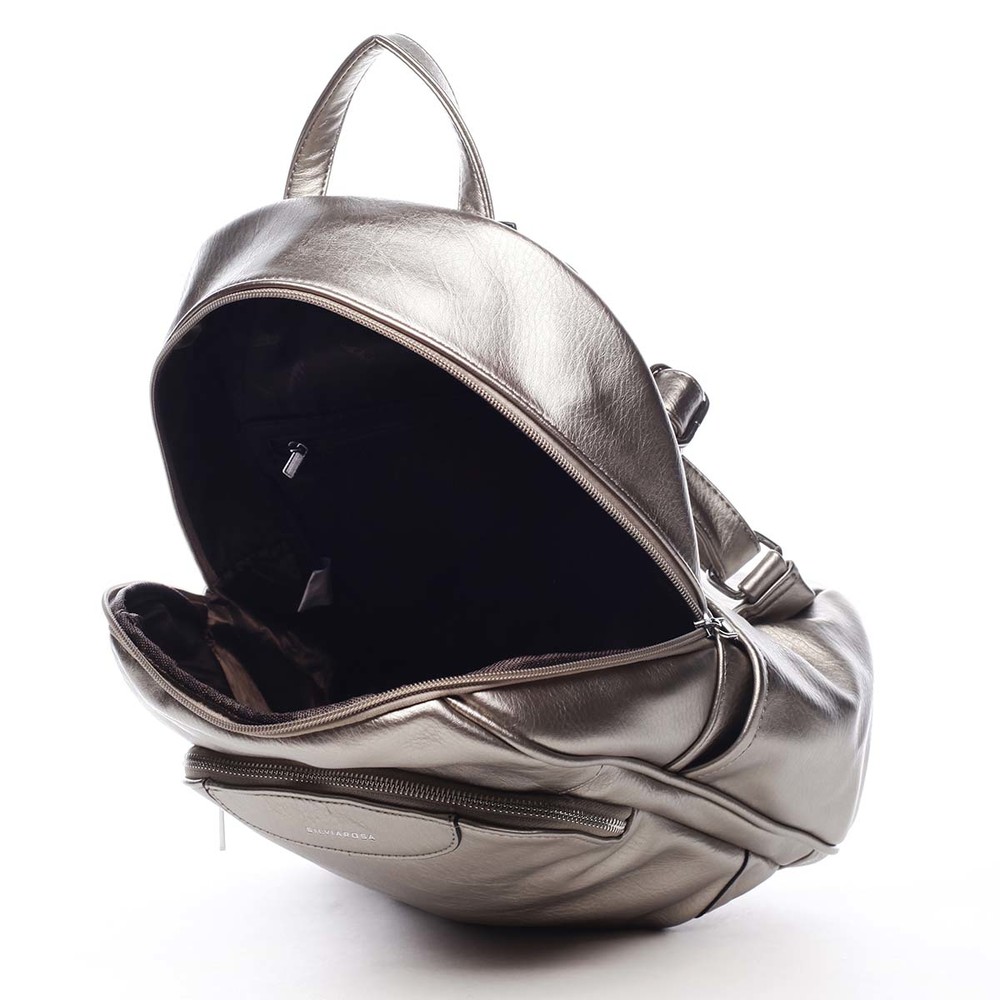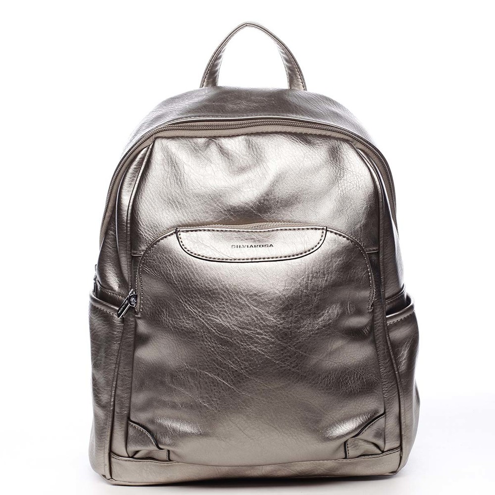 Dámský, větší, městský, měkčí, trendy, zlatě stříbrný, batůžek Silvia Rosa. Batůžek je kvalitně zpracovaný z měkké umělé kůže a hodí se pro dámy i slečny. Má pevnější dno a jeho popruhy jsou nastavitelné. Hlavní kapsa, zaoblena do půlky batohu, se zavírá zipem. Uvnitř hlavního prostoru jsou další kapsičky na drobnosti, dvě volné a jedna se zipem. Tento trendy batoh pro krásné dny musíte mít. Osvěží váš outfit a zároveň Vám prakticky poslouží při všech činnostech. Další kapsy najdete na bocích batohu a na přední i zadní straně. Objednejte ještě dnes a vyzkoušejte, vrátit ji můžete až za 30 dnů!