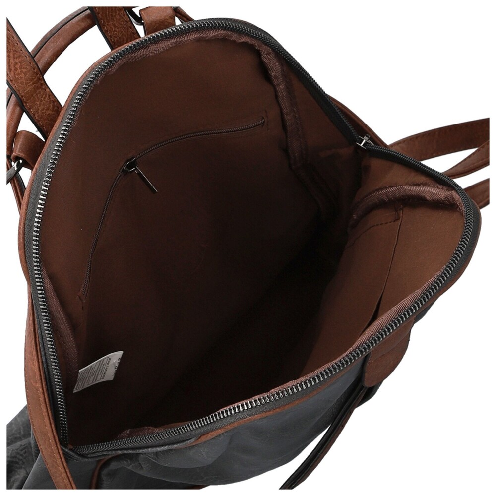 Koženkový kabelko-batoh, který spojuje praktičnost batohu a elegantní vzhled kabelky, zaujme už na první pohled svou originálně řešenou přední stranou. Dominantní hladký povrch v podzimním odstínu doplňují hnědé detaily, od horního lemu, přes pevné ucho, nastavitelné popruhy až po detail ve spodní části. Do přední strany je chytře ukrytá svislá zipová kapsa, ideální na drobnosti. Hlavní kapsa je zabezpečena zipem a uvnitř najdete praktické kapsičky v podšívce pro lepší organizaci. Na zadní straně nechybí další zipová kapsa, skrytá a bezpečná. Batoh je vybaven nastavitelnými popruhy, které se pohodlně přizpůsobí. Vše doplňuje stříbrné kování. Objednejte ještě dnes a vyzkoušejte, vrátit jej můžete až do 30 dnů!