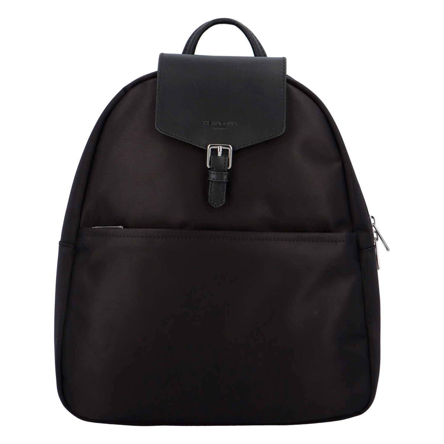 Středně velký černý batoh do města, z voděodolného nylonu, od značky Hexagona. Ten musíte objednat ještě dnes a vyzkoušet, vrátit jej můžete až za 30 dnů! Zaujme Vás malá klopka s řemínkem, pod kterým je malý magnetický cvoček. Součástí přední strany je také střední kapsa se zipem, ten je mírně překrytý. Detaily tohoto batohu jsou kožené. Celkově je určitě užitečný, praktický, lehký a měkký, ale drží dobře svůj tvar. Ucho batůžku je z kůže, popruhy jsou z polyesteru. Hlavní kapsa se otevírá duálním zipem, ten zasahuje až do poloviny batohu. Uvnitř jsou tři klasické přihrádky na telefon, drobnosti a cennosti a také lehce polstrovaná přihrádka na tablet nebo malý macbook (max. 23,5 x 27 cm).