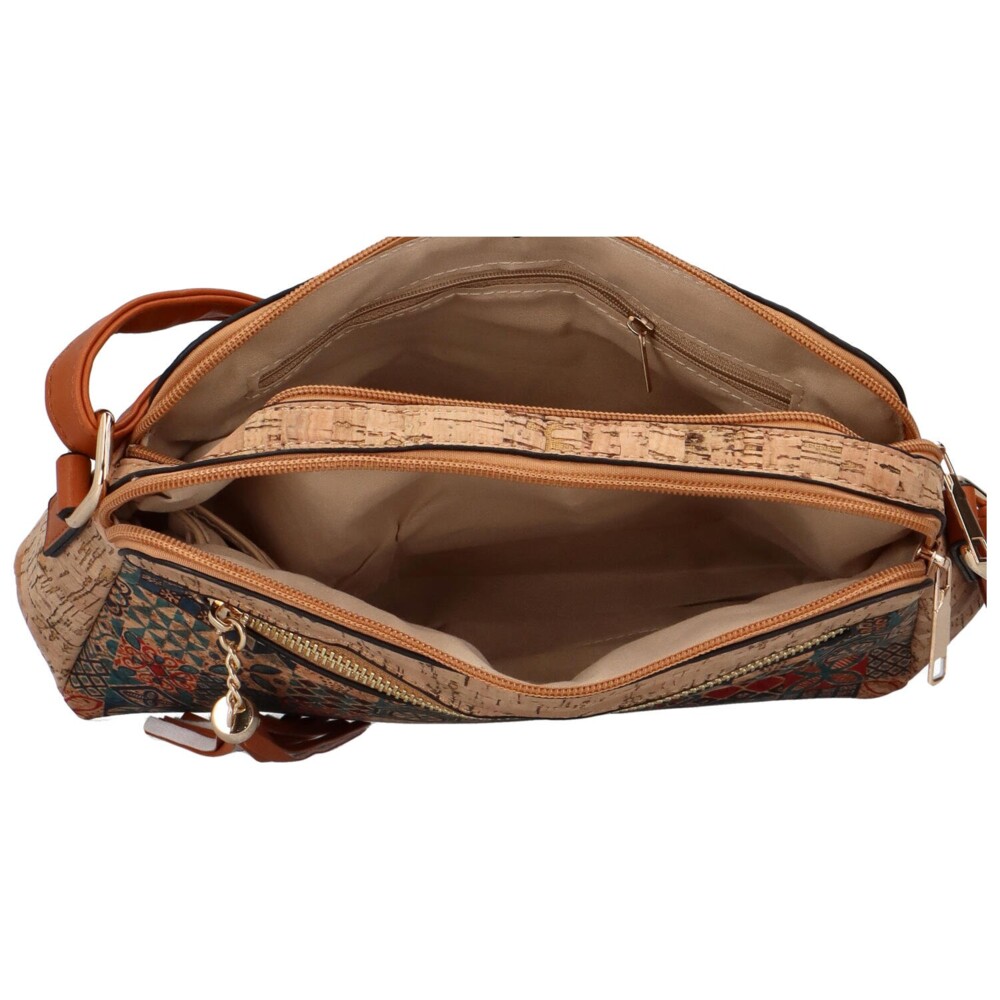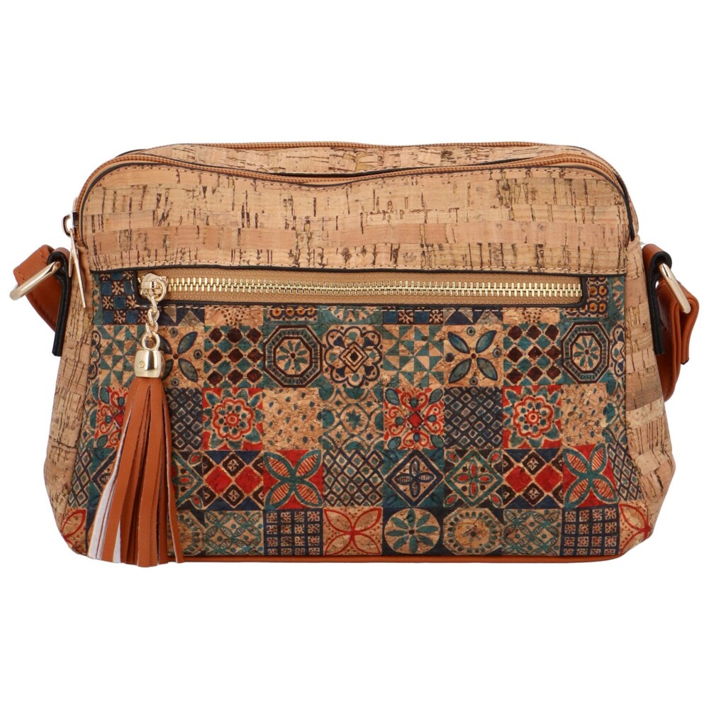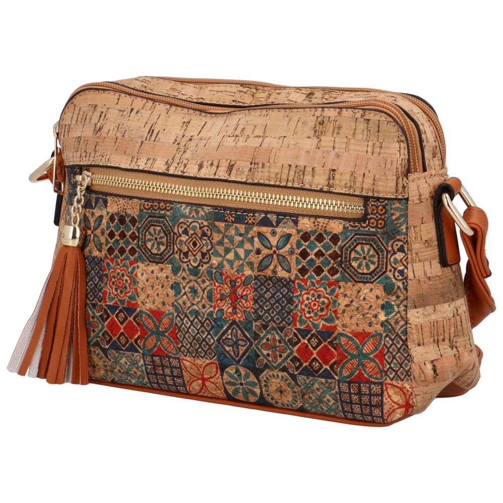 Stylová střední crossbody kabelka vás zaujme díky svému přírodnímu materiálu, ale i osobitým potiskem, který ji dodává jedinečnost. Praktické koženkové prvky vytvářejí s korkem příjemný kontrast a kování ve zlaté barvě bude odrážet každý sluneční paprsek při každém vašem kroku. Ideální doplněk pro letní dny. Objednejte ještě dnes a vyzkoušejte, vrátit ji můžete až za 30 dnů! Každý model z nové kolekce má svůj jedinečný potisk na přední straně. Nad ním můžete využít menší kapsu na zip, kterou zdobí koženkový střapec. Své věci můžete roztřídit do dvou hlavních úložných prostorů – v prvním najdete i otevřenou přihrádku, ve druhém zase uzavíratelnou kapsičku všitou do podšívky. Poslední menší kapsa je umístěna na zadní straně. Koženkový popruh ladí s celkem a můžete regulovat jeho délku.