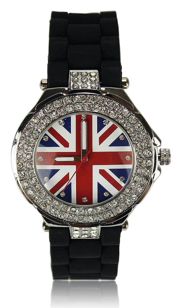 Krásné černé módní dámské hodinky s kamínky a vlajkou UK. Průměr ciferníku 4 cm. Silikonový pásek. Strojek Quartz.