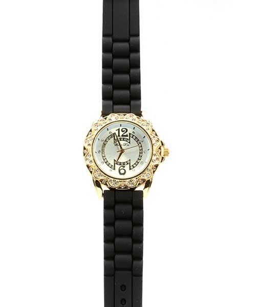 Módní dámské zlaté hodinky s kamínky. Průměr ciferníku 4 cm. Silikonový pásek.