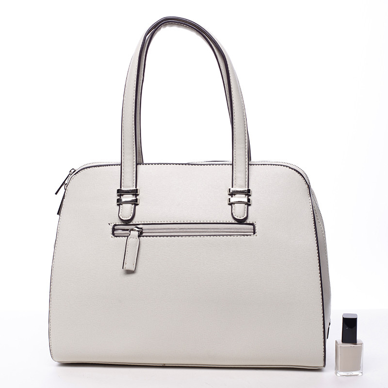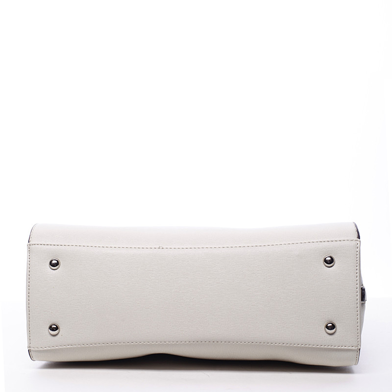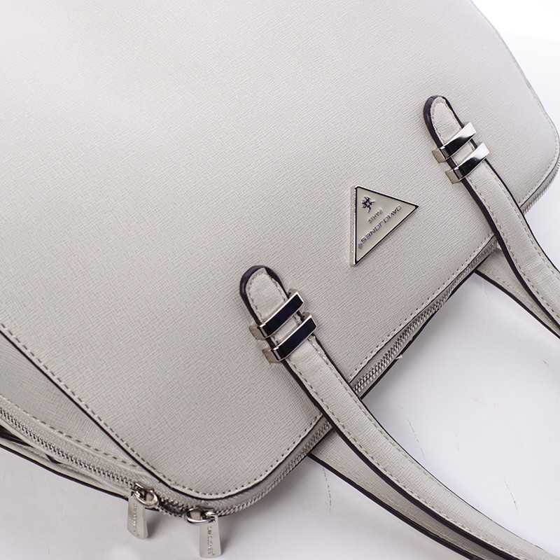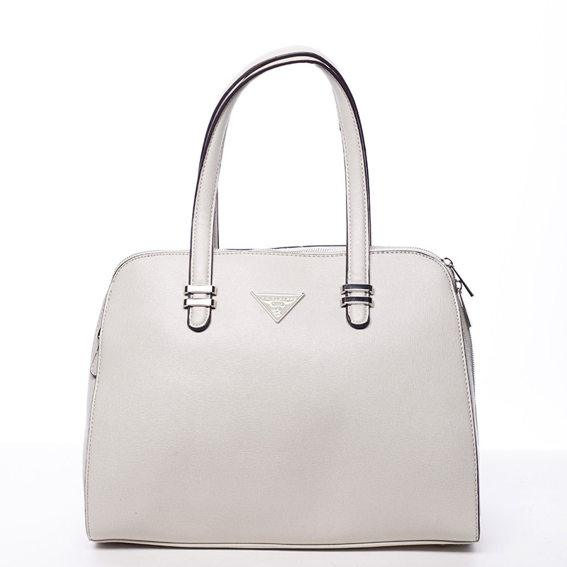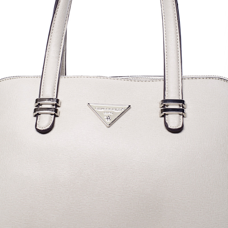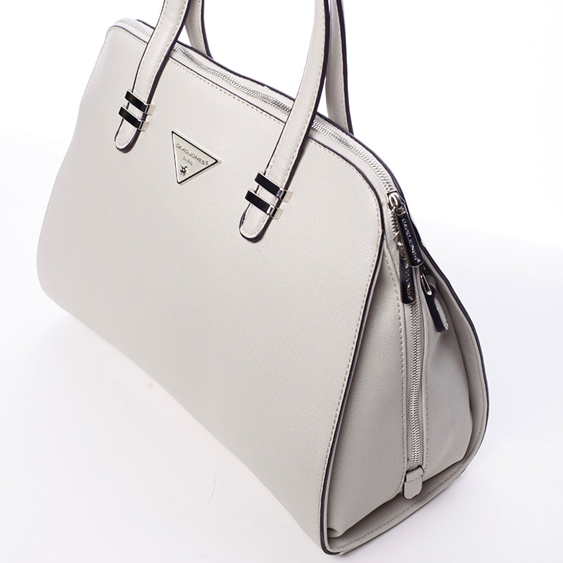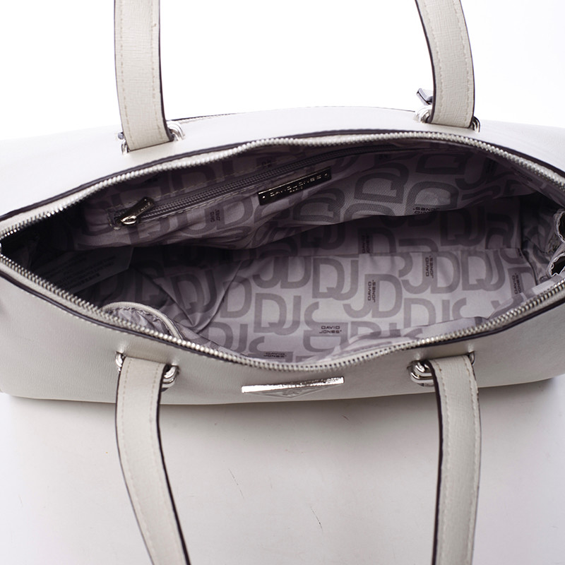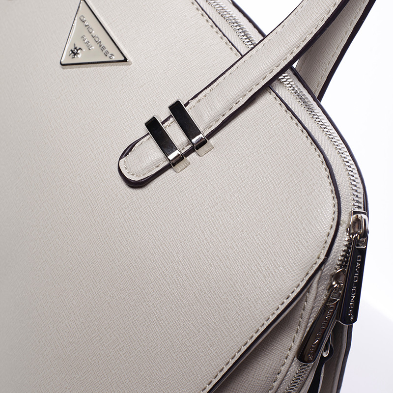 Béžová až krémová luxusní kabelka do ruky David Jones. Opravdu povedený kousek ve stylu Prada. Uvnitř je nedělený prostor a postranní kapsičky na mobil nebo peněženku. Podšívka je posetá logy DJ. Kabelku můžete nosit přes rameno s popruhem nebo v ruce. Zespodu jsou ochranné cvočky. Novinka jaro 2016!