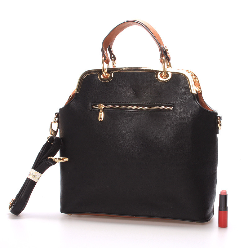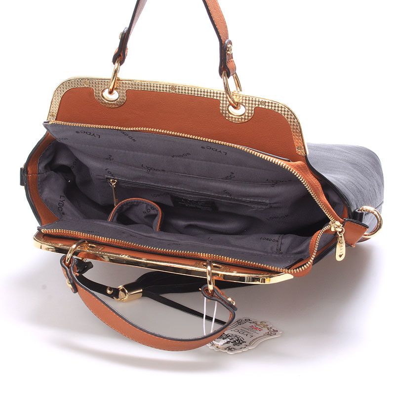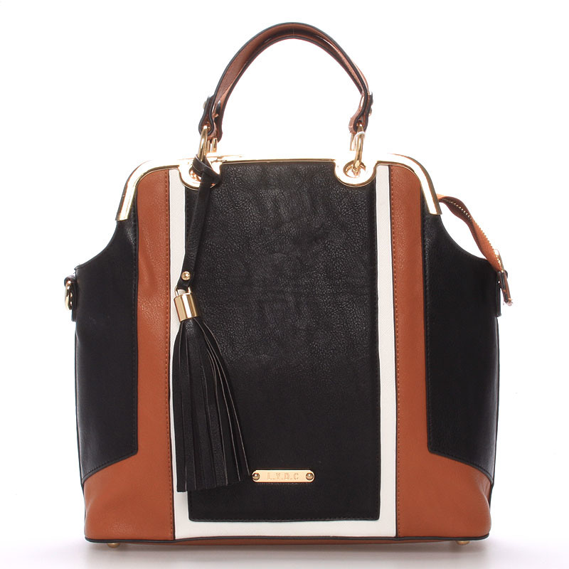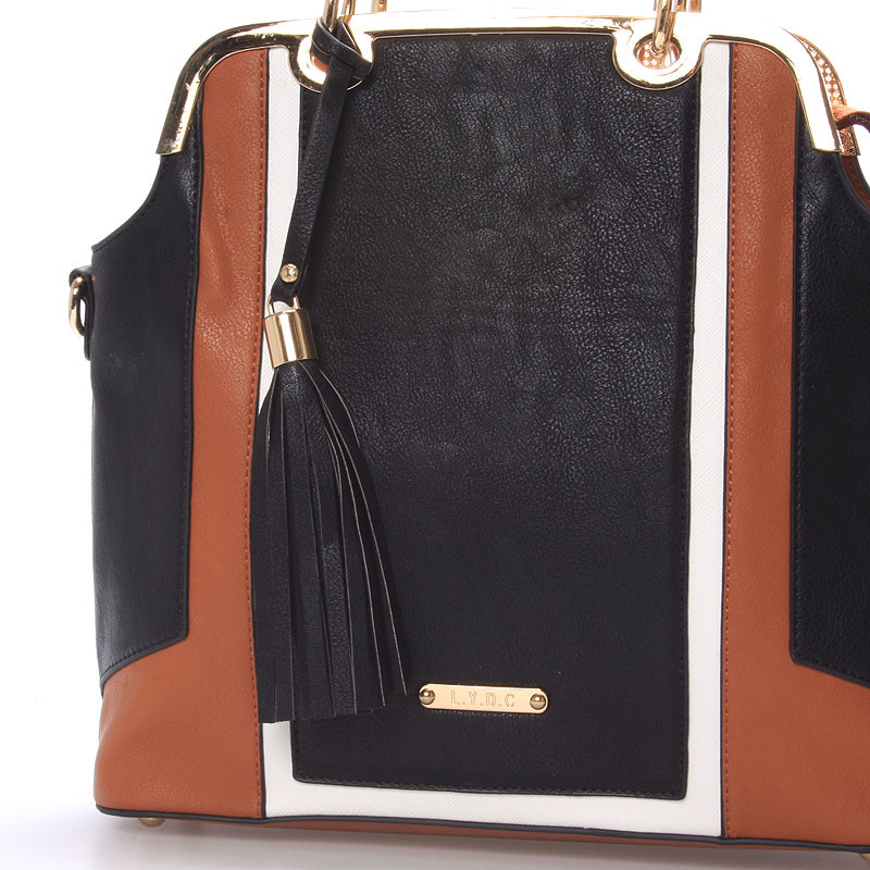 Luxusní dámská černo-hnědá kabelka LYDC s výrazným zlatým kováním. Kabelka je pevná, drží svůj tvar, uvnitř má menší kapsičky na drobnosti a ke kabelce lze připnout popruh. Novinka 2016/2017.
