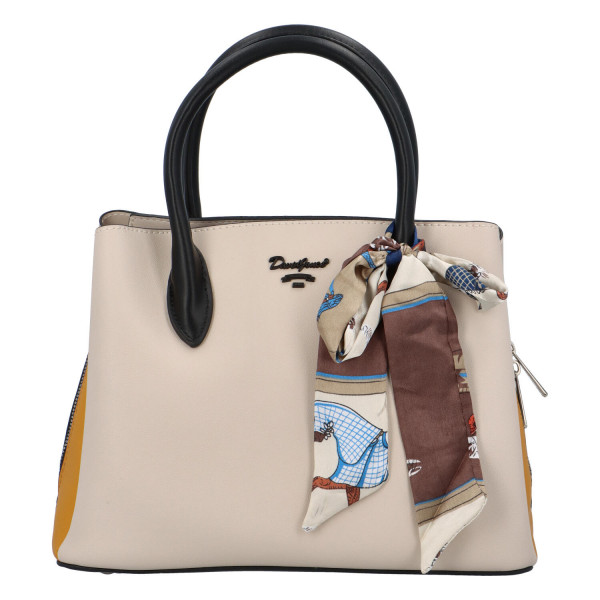 Elegantní kousek v podobě dámské, středně velké, béžové kabelky do ruky nebo přes rameno, od značky David Jones. Nosit ji můžete v ruce, na předloktí nebo s popruhem přes rameno. Objednejte ještě dnes a vyzkoušejte, vrátit ji můžete až za 30 dnů! Kabelka je pevnější, má pevné dno posázené čtyřmi kovovými cvočky a drží dobře svůj tvar. Má tři hlavní prostory, dva se uzavírají magnetickými cvoky a prostřední zipem. Bonusem je líbivý barevný šáteček na uchu kabelky a boky zbarvené do žluta.