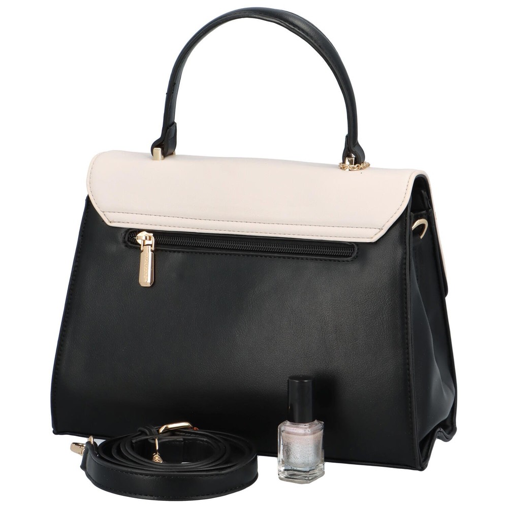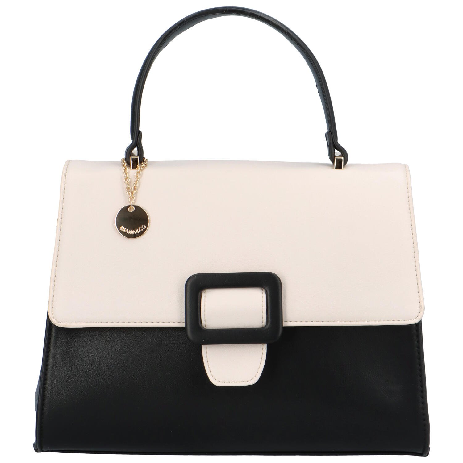 Originální, středně velká, dámská kabelka, kterou lze nosit za ucho v ruce, na předloktí nebo přes zápěstí, také díky popruhu přes rameno, od oblíbené moderní značky DIANA & CO. Objednejte ještě dnes a vyzkoušejte, vrátit ji můžete až za 30 dnů! Dvoubarevnou kabelku můžete nosit do města, na párty i do společnosti. Černá pevná taška se světle béžovou klopou se otevírá magnetem v podobě černé spony s béžovým páskem. Hlavní část kabelky se otevírá zipem. Chybět Vám nebudou klasické kapsičky uvnitř ani na zadní straně kabelky. Celkově je kabelka pevnější s měkčími bočními stěnami. Bonusem je malý kovový přívěsek s logem značky.