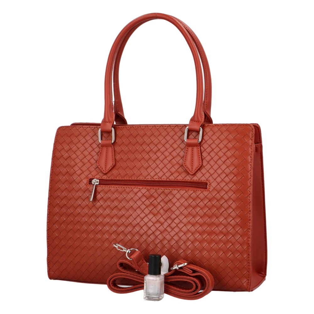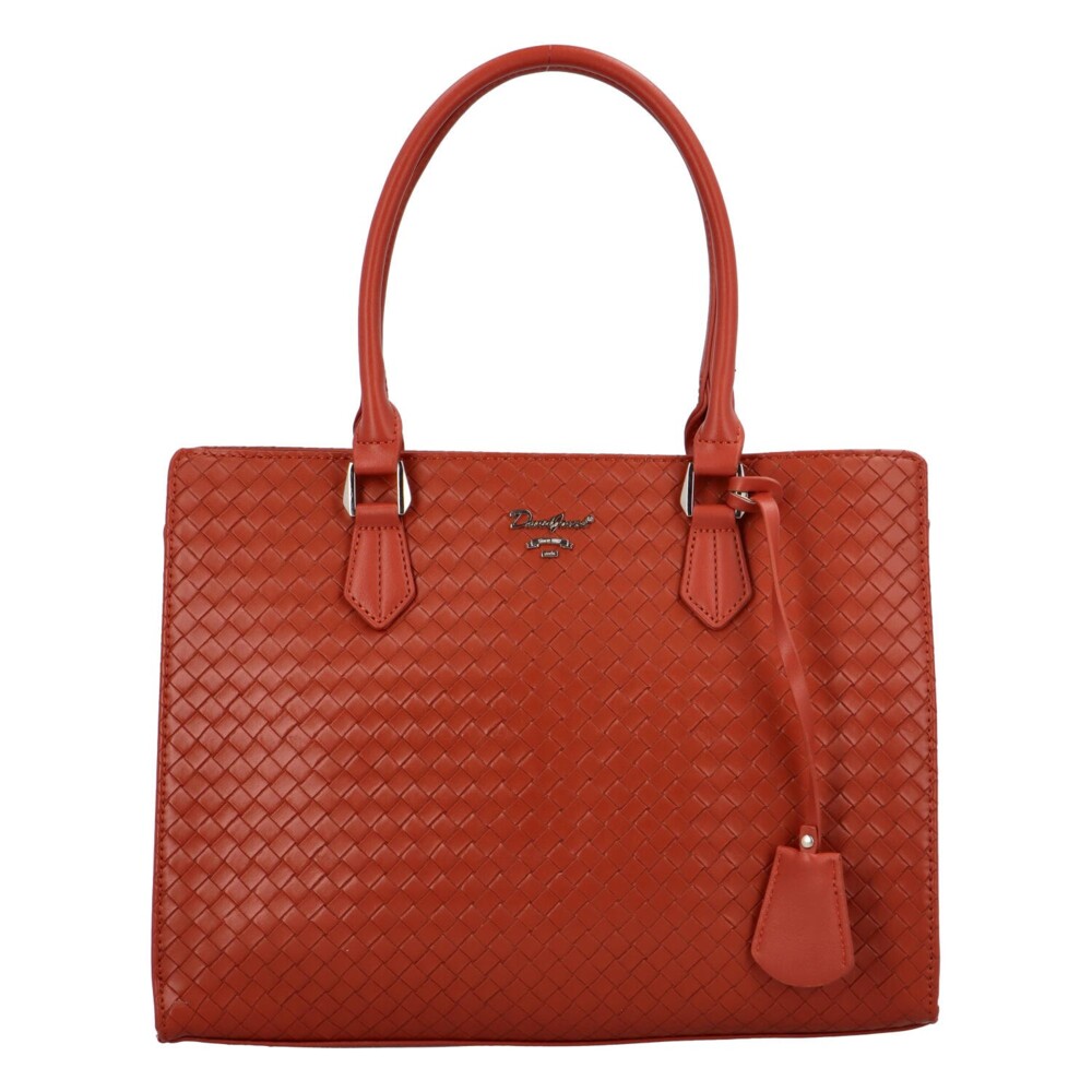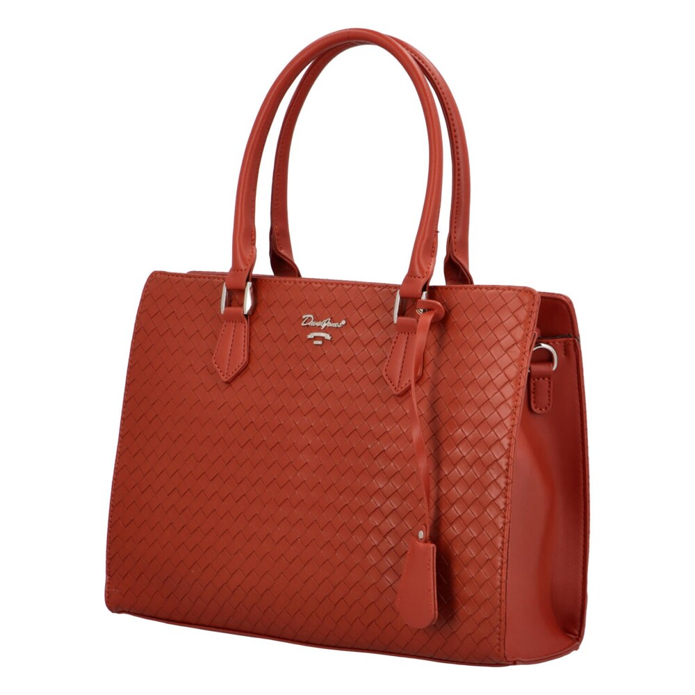 Stylová dámská kabelka značky David Jones v cihlově červené barvě. Ideální doplněk pro každodenní nošení přes rameno i pro formálnější příležitost do ruky. Moderní strukturovaný design s originálním vzorem působí na syntetické kůži luxusně a nadčasově. Kabelka nabízí dostatek prostoru pro všechny nezbytnosti, má velkou hlavní kapsu na zip a 3 malé kapsičky na drobnosti, z nichž jsou dvě volné. Součástí je odnímatelný a nastavitelný popruh. Spodní část kabelky má kovové cvočky, které zabraní odření kabelky při pokládání. Díky pevnějším uším se nosí velmi pohodlně. Praktický přívěsek skvěle ladí a celkově kabelky doplní pracovní outfit i městský styl. Tak objednejte ještě dnes a vyzkoušejte, vrátit ji můžete do 30ti dnů.