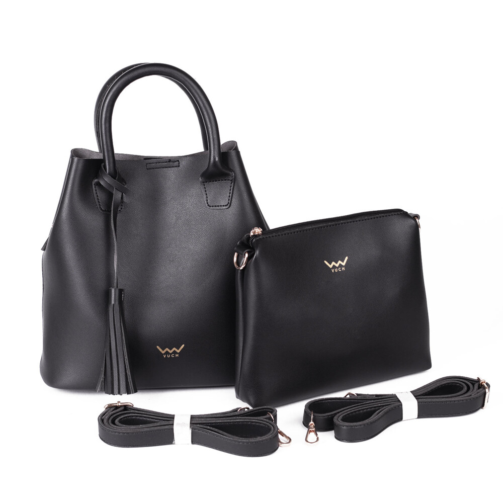 Pevná kabelka do ruky pro ženy v černé barvě od značky Vuch. Díky popruhu ji lze nosit i přes rameno. Je hladká, elegantní a módní. Super věc jsou dva popruhy! Jeden využijete k samotné kabelce, druhý popruh můžete připnout k další čísti kabelky a nosit ji tak jako crossbody. Kabelka má totiž uvnitř hlavního prostoru na magnet další kabelku! ✅ Jedná se tedy o tašku 2v1! Nosit ji můžete za pohodlné zakulacené uši. Boky lze navíc sepnout cvokem, díky kterému lze kabelku zúžit.