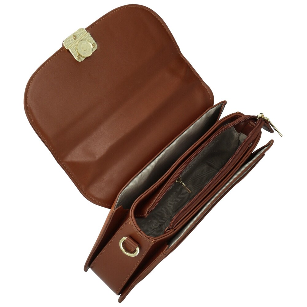 Stylová malá koženková kabelka v kufříkovém provedení. Zaoblená klopa skrývá hlavní kapsu na zip, uvnitř doplněnou menšími kapsičkami v podšívce a otevřenými kapsami vpředu i vzadu pro drobnosti. Pevné ucho umožňuje pohodlné nošení v ruce, dlouhý odnímatelný popruh zase promění kabelku na praktickou crossbody. Zlaté kování dodává elegantní a sofistikovaný detail. Krásný doplněk pro ženy, které hledají spojení praktičnosti, elegance a nezaměnitelného stylu. Objednejte ještě dnes a vyzkoušejte, vrátit ji můžete až do 30 dnů!