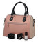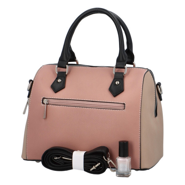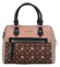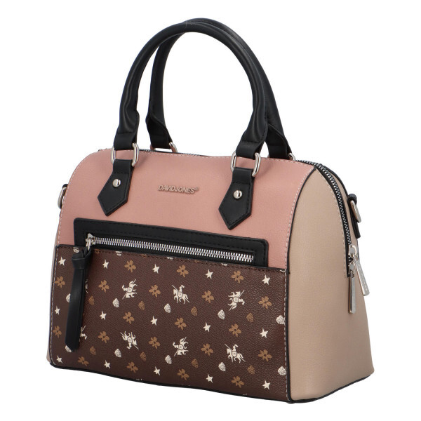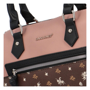 Středně velká, elegantní a moderní kabelka do ruky nebo přes rameno, od značky David Jones. Objednejte ještě dnes a vyzkoušejte, vrátit ji můžete až za 30 dnů! Tento model má velice zajímavý vzor. Celkově se řadí mezi pevné typy. Kabelka má růžovo hnědou barvu s černými detaily, pevnější uši a spodní strana disponuje kovové cvočky pro lepší stabilitu, také zabrání odření kabelky. Většina kapes na kabelce se otevírá zipy. Na telefon Vám poslouží volná kapsička uvnitř hlavní kapsy.
