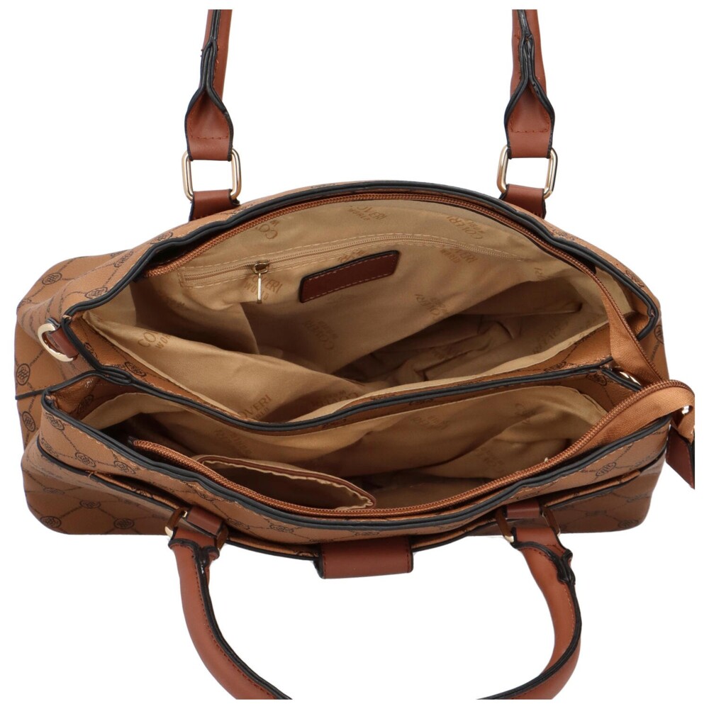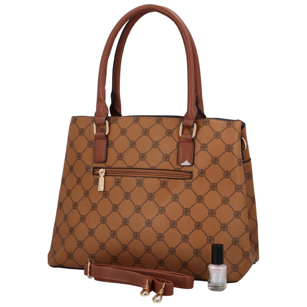 Luxusní dámská kabelka ze syntetické kůže s módním potiskem. Kabelka má dvě pevné uši na nošení v ruce. Po otevření zipu se nám nabízí hned dvě hlavní přihrádky a uvnitř na bočních stranách malé kapsičky na vaše drobnosti. Na přední straně se nachází kapsa na magnet a logo značky. V zadní části kapsička na zip. Na kabelce je módní potisk a její kování je ve zlaté barvě. Koženkový popruh lze nastavovat a odnímat. Kabelka působí stylově a elegantně. Tak objednejte ještě dnes a vyzkoušejte, vrátit ji můžete do 30ti dnů.
