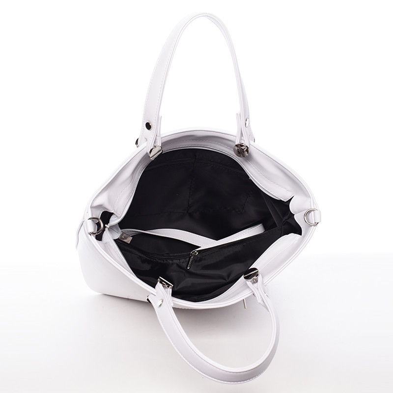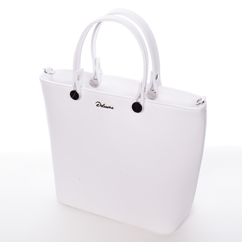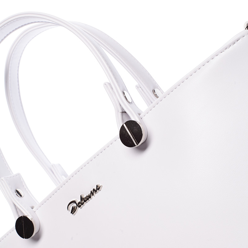Dámská větší bílá kabelka do ruky s možností nastavitelného popruhu Delami. Kabelka se zavíra zipem po celé své délce. Kabelka je pevná s pevným dnem. Uvnitř je dělený prostor kapsou na zip, dále postranní kapsičky. Zespodu jsou kovové cvočky proti poškrábání dna. Novinka. Objednejte ještě dnes a vyzkoušejte, vrátit ji můžete až za 30 dnů!