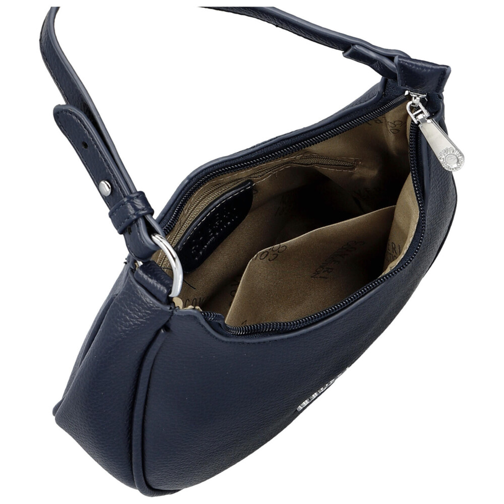 Kabelka typu gondolka značky Coveri – dokonalá kombinace eleganci a retro stylu který se teď znovu vrací. Tato malá tmavě modrá kabelka s jedním uchem a připínatelným textilním popruhem v barvě kabelky perfektně podtrhne Váš outfit né jen když vyrazíte do města, ale i do společnosti - definitivně kabelka kterou můžete použít i jako společenskou. Přineste do svého života nádech elegance a praktičnosti s touto unikátní kabelkou Venetia od značky Coveri.