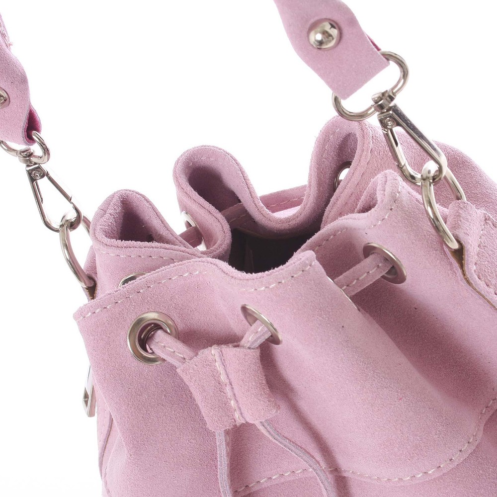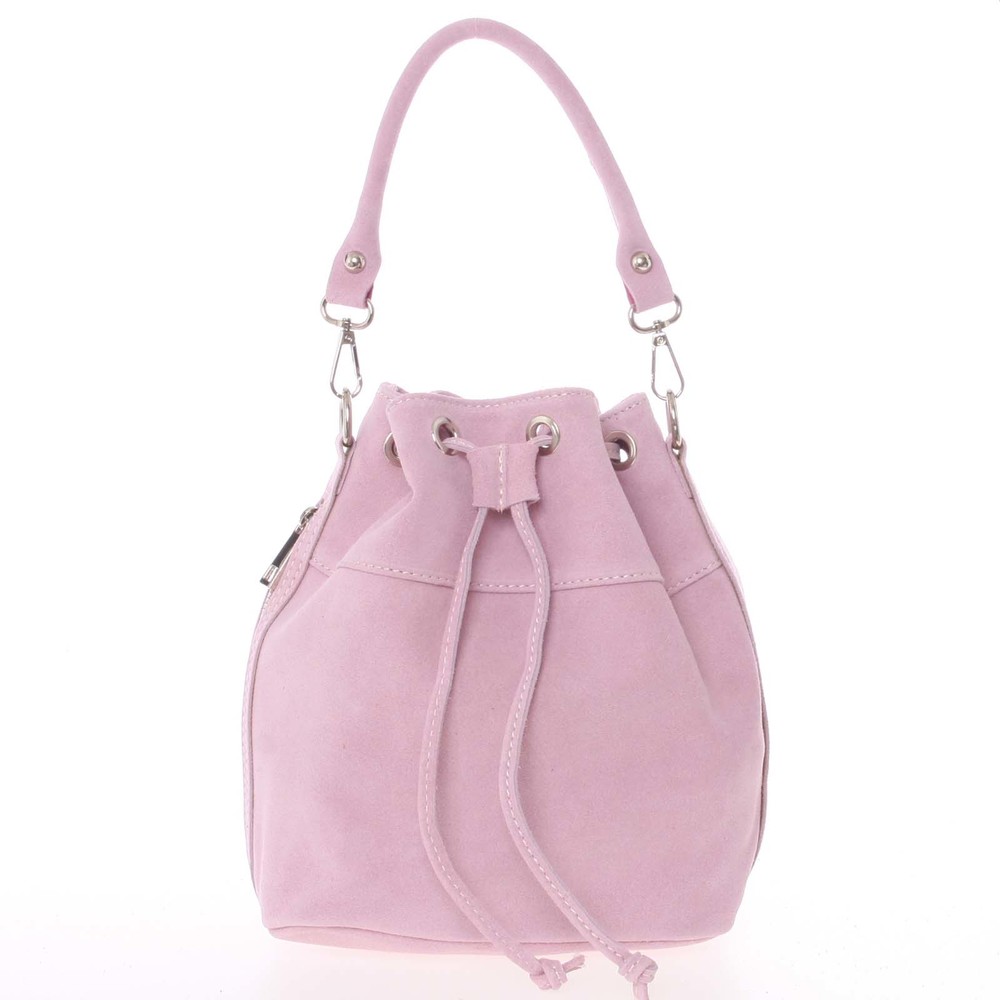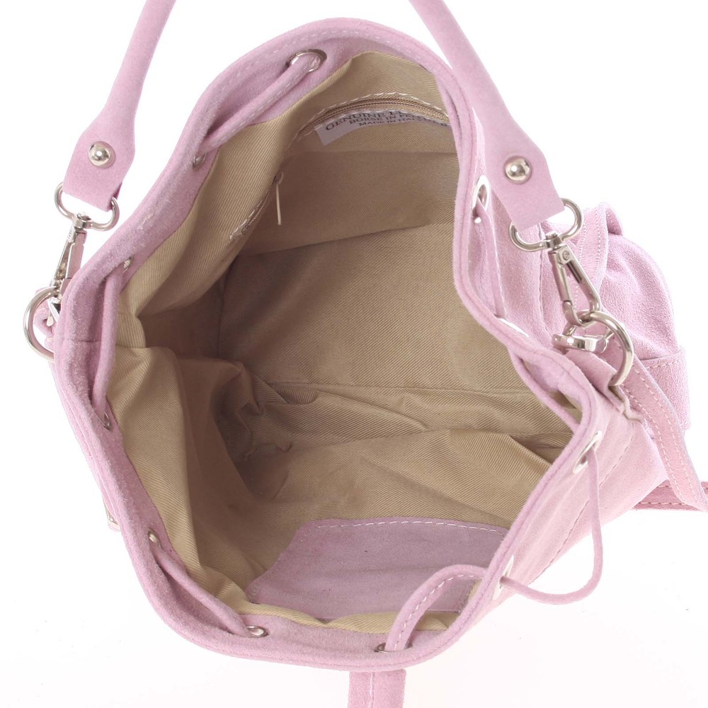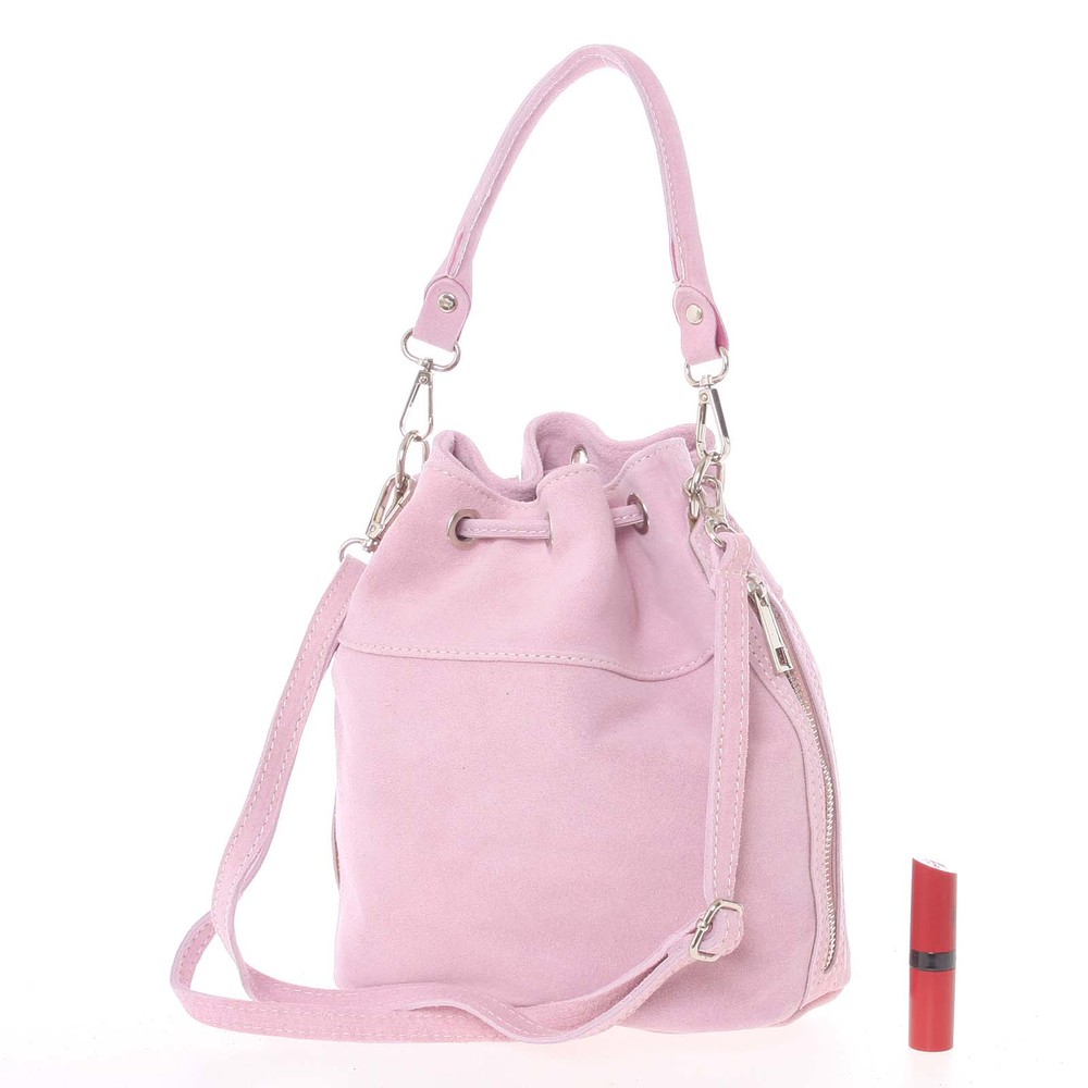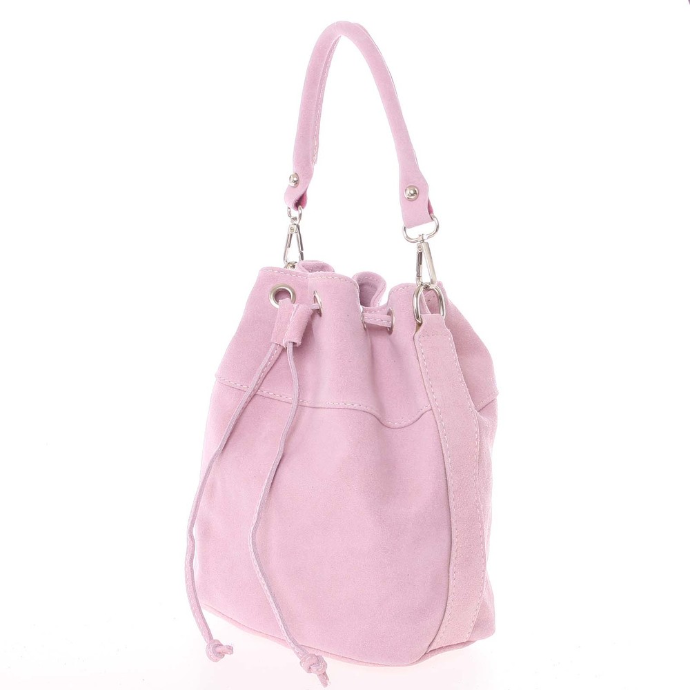 Luxusní světle růžový výrobek značky Italy na sebe nenechal dlouho čekat. Vyberte si právě tento ke svému stylovému outfitu. Tato semišová kožená kabelka do ruky se nosí přímo sama! Unikátní italský výrobek znázorňuje samotnou Veronu! Objednejte ještě dnes a vyzkoušejte, vrátit ji můžete až za 30 dnů! Kabelka disponuje dvěma odnímatelnými popruhy. Uzavírá se koženou šňůrkou, která lze stáhnout. Uvnitř jsou dvě menší kapsy na drobnosti a cennosti, další kapsa je svislá, na boku kabelky.