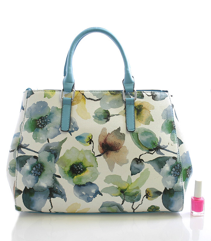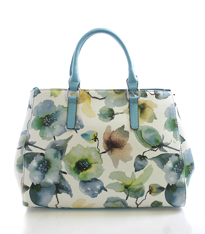 Tyrkysová vetší kabelka Delami s motivem květin. Uvnitř je rozdělena kapsou na zip, dále postranní kapsa na zip a dvě menší kapsy bez zipu. Kabelku lze nosit v ruce nebo na předloktí. Součástí je odnímatelný popruh. Kování je ve stříbrném provedení. Svěží jarní kabelka pro sezónu 2015.