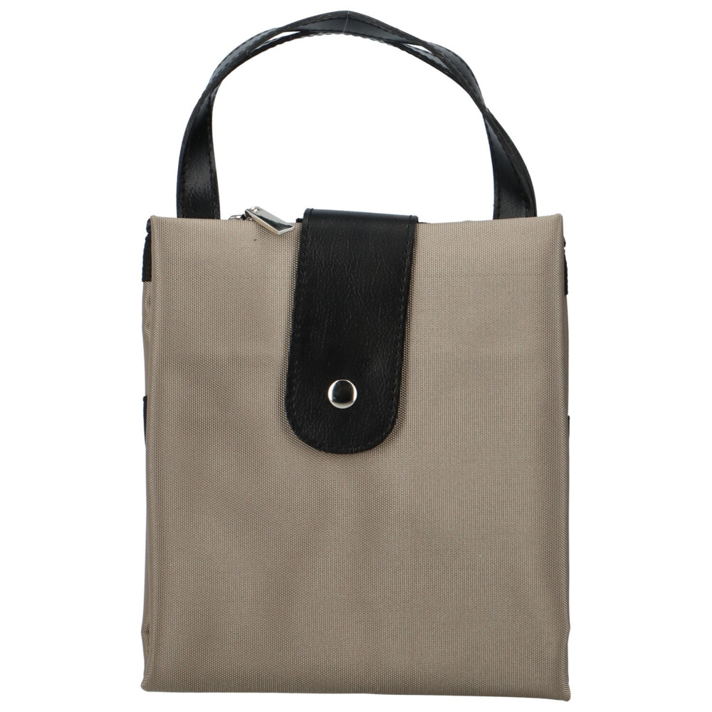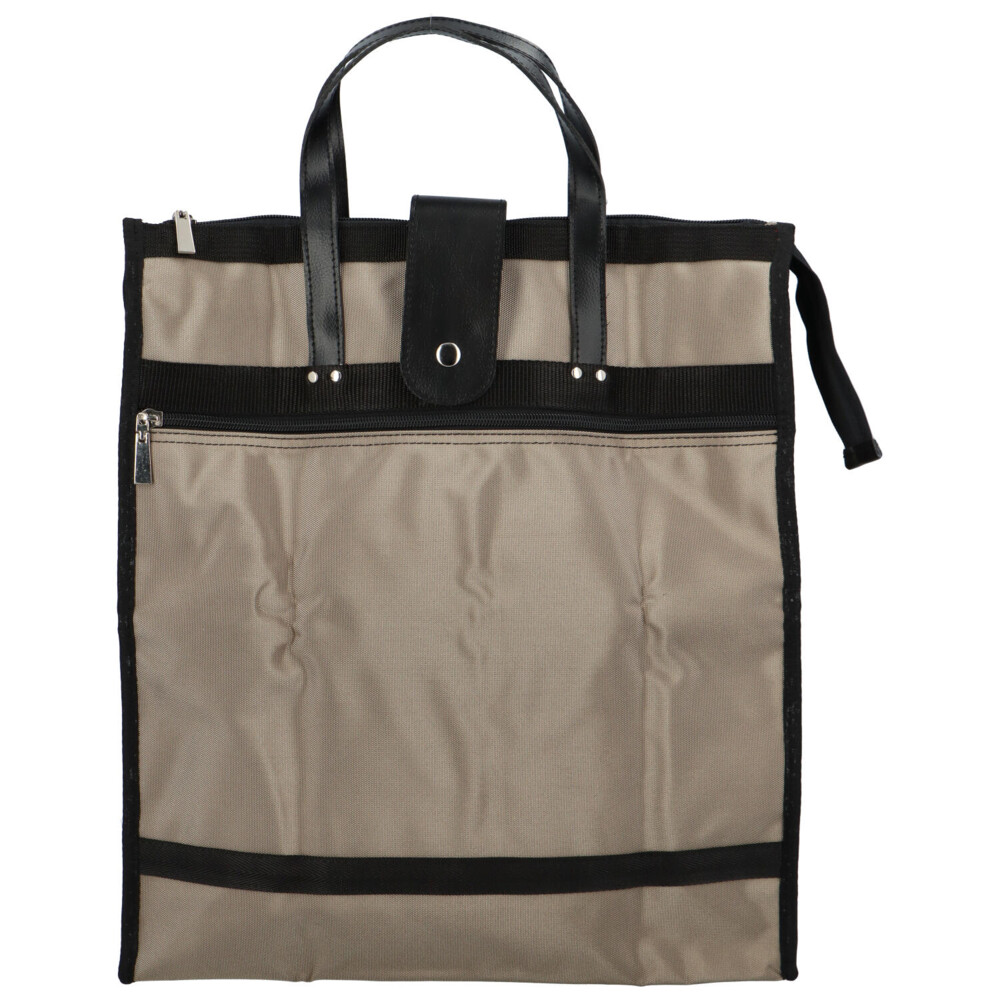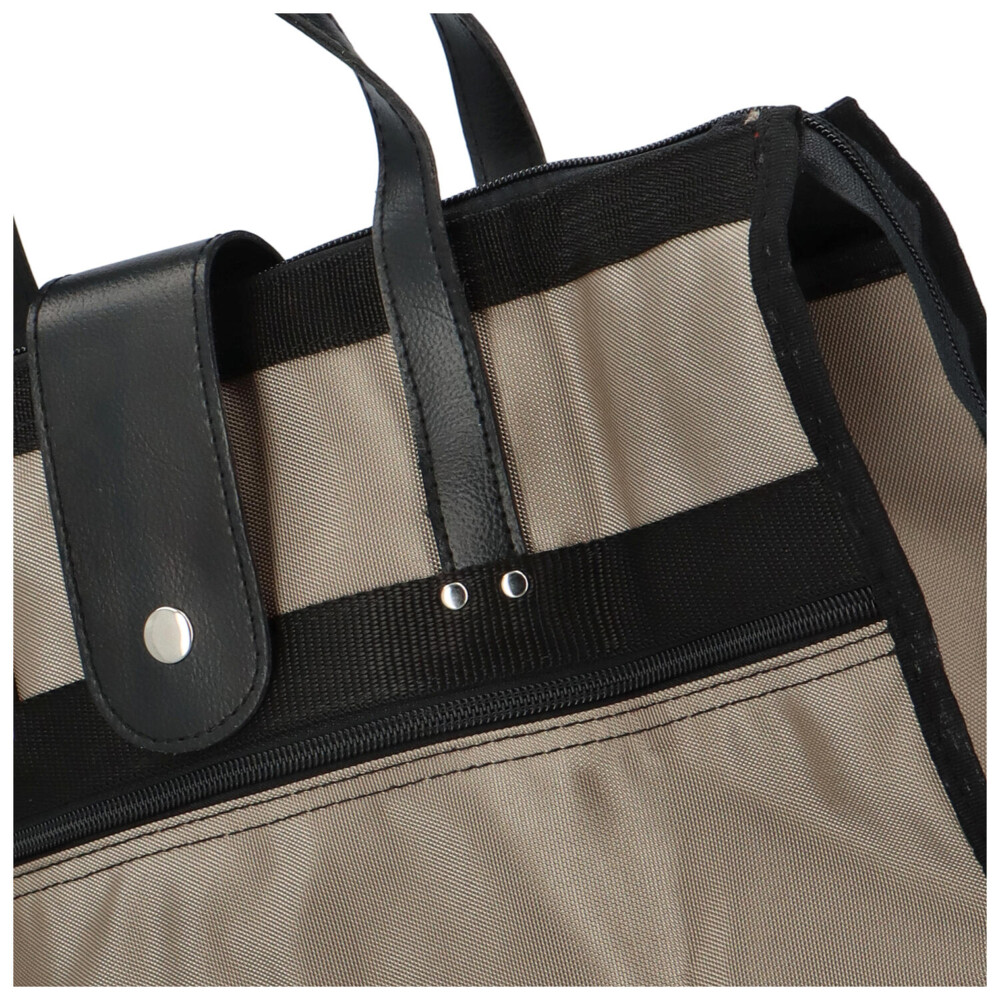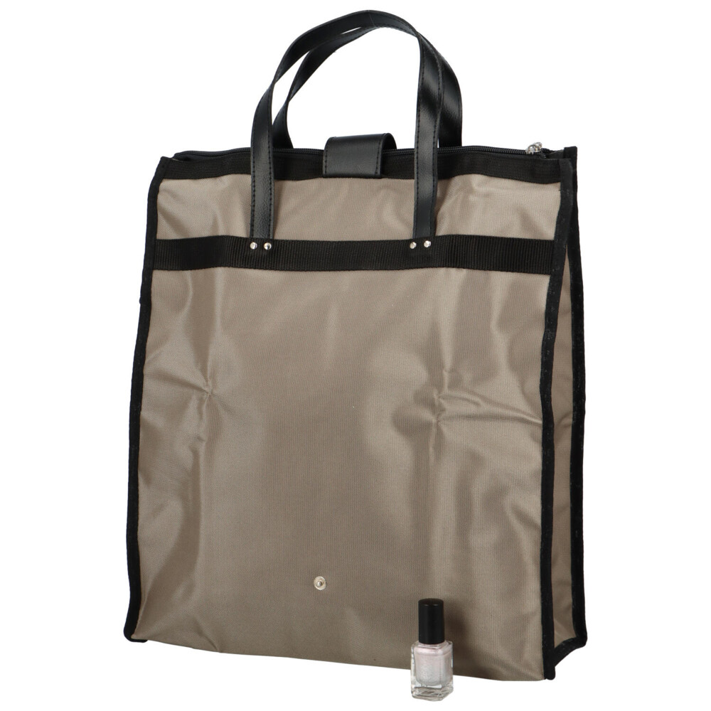 Velká prostorná tmavě béžová taška s černými prvky se bude hodit na nákupy. Hlavní kapsa je uzavíratelná na zip, je prostorná a z odolného materiálu. Kapsa na zip se nachází i na přední straně tašky. Uši tašky jsou koženkové a pevné. Celou tašku lze pohodlně složit do malého rozměru, zajistit přezkou s kovovým cvočkem a schovat do kabelky, nebo tašky. S touto nákupní taškou už bude nakupování hračka!
