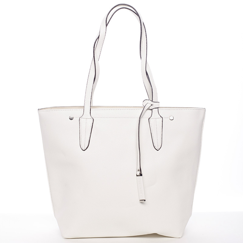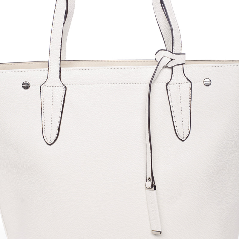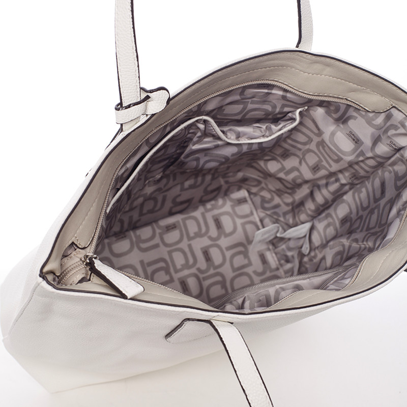 Nabízíme vám elegantní větší prostornou kabelku David Jones z jarně letní kolekce 2016 v bílé barvě. Kabelka se vyznačuje jemnou elegancí, velkým prostorem a kvalitním zpracováním. Uvnitř vám kabelka nabídne menší kapsy bez zipu a se zipem. Podšívka je šedá s logy DJ. Kabelku můžete nosit přes rameno nebo v ruce. Novinka léto 2016!