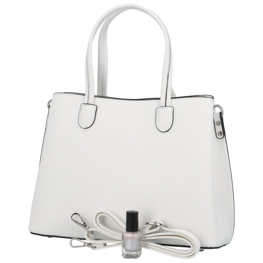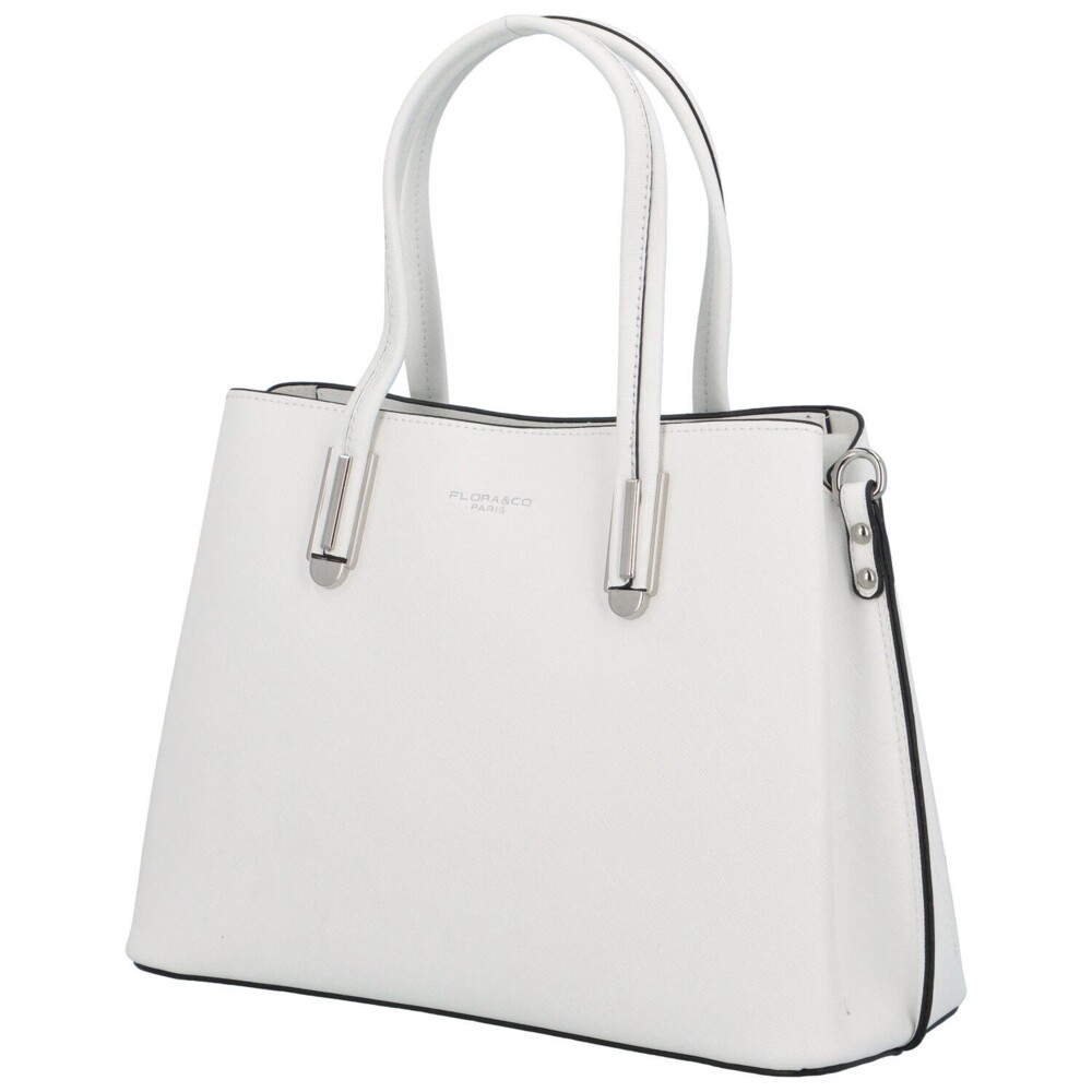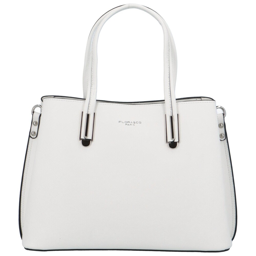 Elegantní bílá kabelka do ruky od francouzské značky FLORA&CO. Kabelka je střední velikosti, je pevná a drží tvar. Nosit ji můžete na předloktí, v ruce, ale i přes rameno díky odnímatelnému popruhu. Uši kabelky jsou pevné a zakulacené. Kabelka má tři hlavní oddělené kapsy, prostřední se uzavírá zipem a má uvnitř přihrádky na drobnosti, další dvě jsou na magnetický cvoček. Dno kabelky je chráněno kovovými cvočky proti odření. Objednejte ještě dnes a vyzkoušejte, vrátit jej můžete až za 30 dnů!