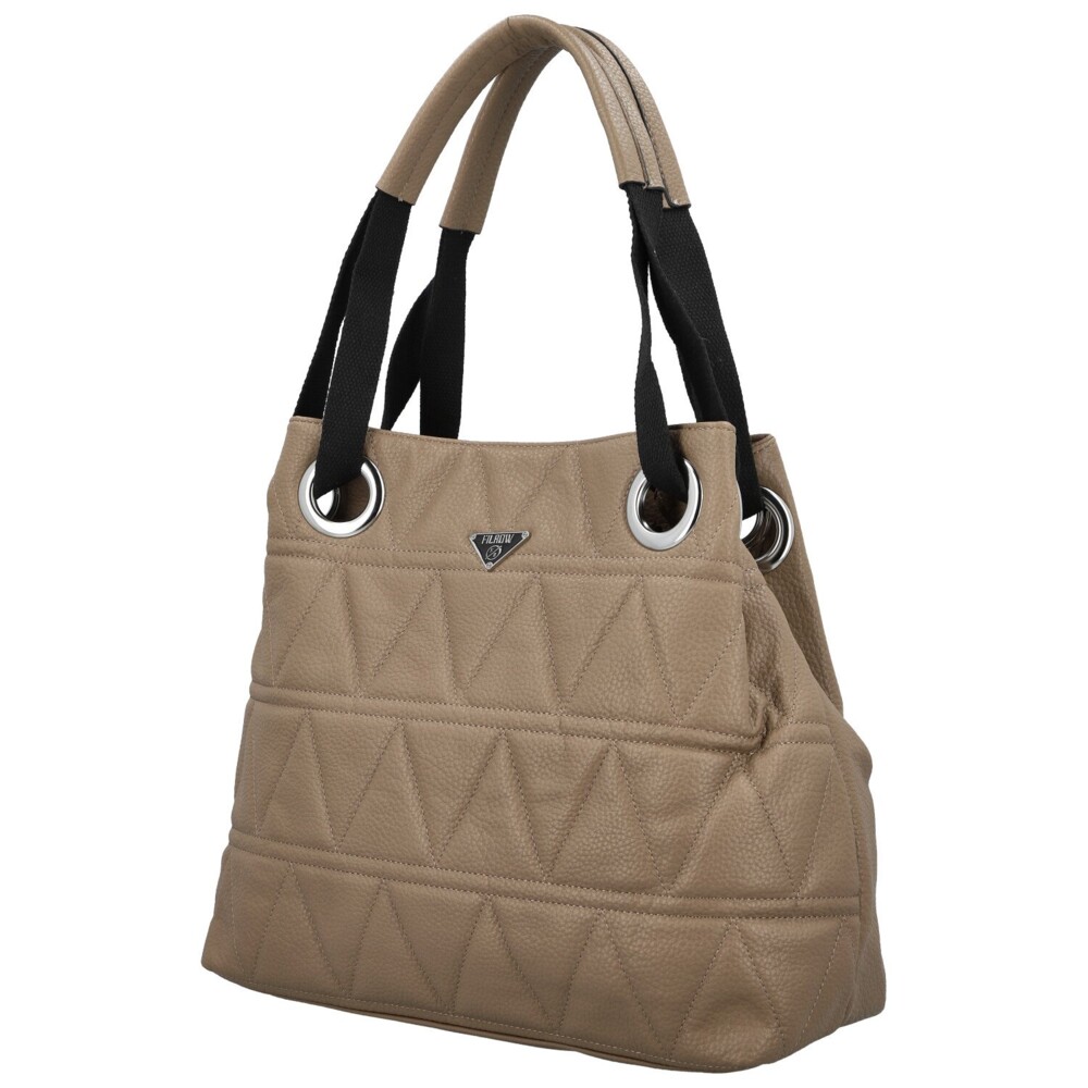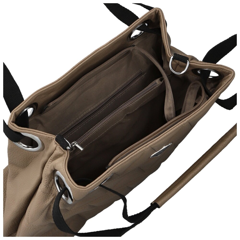 Tato kabelka z kvalitní koženky kombinuje nadčasový design s praktickým uspořádáním. Elegantní tvar, který se směrem k vrchu zužuje, vytváří moderní siluetu, zatímco jemné trojúhelníkové prošití a logo značky na přední straně dodávají osobitý detail. uvnitř hlavní kapsy na zip najdete praktické kapsičky v podšívce i středovou zipovou přihrádku, která udrží pořádek. Zadní zipová kapsa je perfektní na drobnosti. Kabelku můžete držet v ruce díky pohodlným uchům kombinujícím koženku a textil, nebo ji nosit na rameni i díky přídavnému dlouhému popruhu s nastavitelnou délkou. Stříbrné detaily elegantně doplňují celkový vzhled a podtrhují sofistikovanost kabelky. Objednejte ještě dnes a vyzkoušejte, vrátit ji můžete až do 30 dnů!