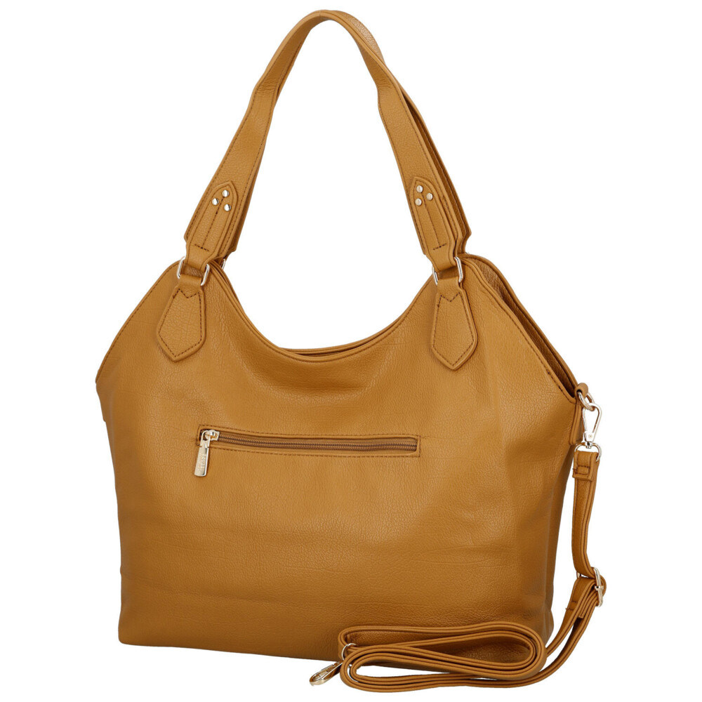 Elegantní dámská koženková kabelka na rameno, která zaujme svým čistým a nadčasovým designem. Přední stranu zdobí decentní logo značky, jež podtrhuje její stylový vzhled. Praktická dvě pevná ucha zajišťují pohodlné nošení v ruce i na rameni, zatímco přídavný nastavitelný popruh nabízí možnost crossbody nošení podle potřeby. Hlavní prostor se zapínáním na zip ukrývá dostatek místa pro každodenní nezbytnosti, uvnitř nechybí kapsičky v podšívce. Na zadní straně je navíc praktická zipová kapsička pro rychlý přístup. Zlaté kování dodává kabelce nádech luxusu a elegantně doplňuje celkový vzhled. Objednejte ještě dnes a vyzkoušejte, vrátit ji můžete až do 30 dnů!