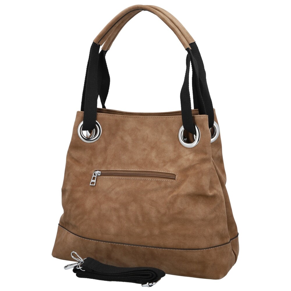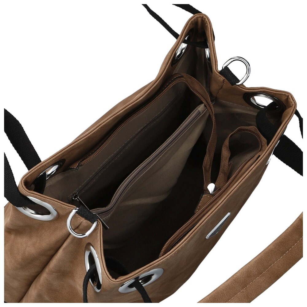 Tahle dámská koženková kabelka zaujme na první pohled svým měkkým tvarem a elegantně ležérním vzhledem. Na přední straně nechybí decentní kovové logo, které spolu se stříbrnými očky vytváří výrazný, ale pořád vkusný detail. Široká textilní ucha procházejí velkými kovovými průvleky, díky čemuž kabelka krásně padne na rameno a zároveň získává zajímavý designový prvek. Na zadní straně je ukrytá praktická zipová kapsa. Hlavní kapsa je zajištěna zipem a uvnitř vás čeká přehledné uspořádání, kapsičky v podšívce i středová zipová část. Pro maximální pohodlí je tu navíc dlouhý textilní popruh na připnutí, díky kterému můžete kabelku nosit i jako crossbody. Stříbrné kování krásně doladí její svěží, moderní vzhled. Objednejte ještě dnes a vyzkoušejte, vrátit ji můžete až do 30 dnů!