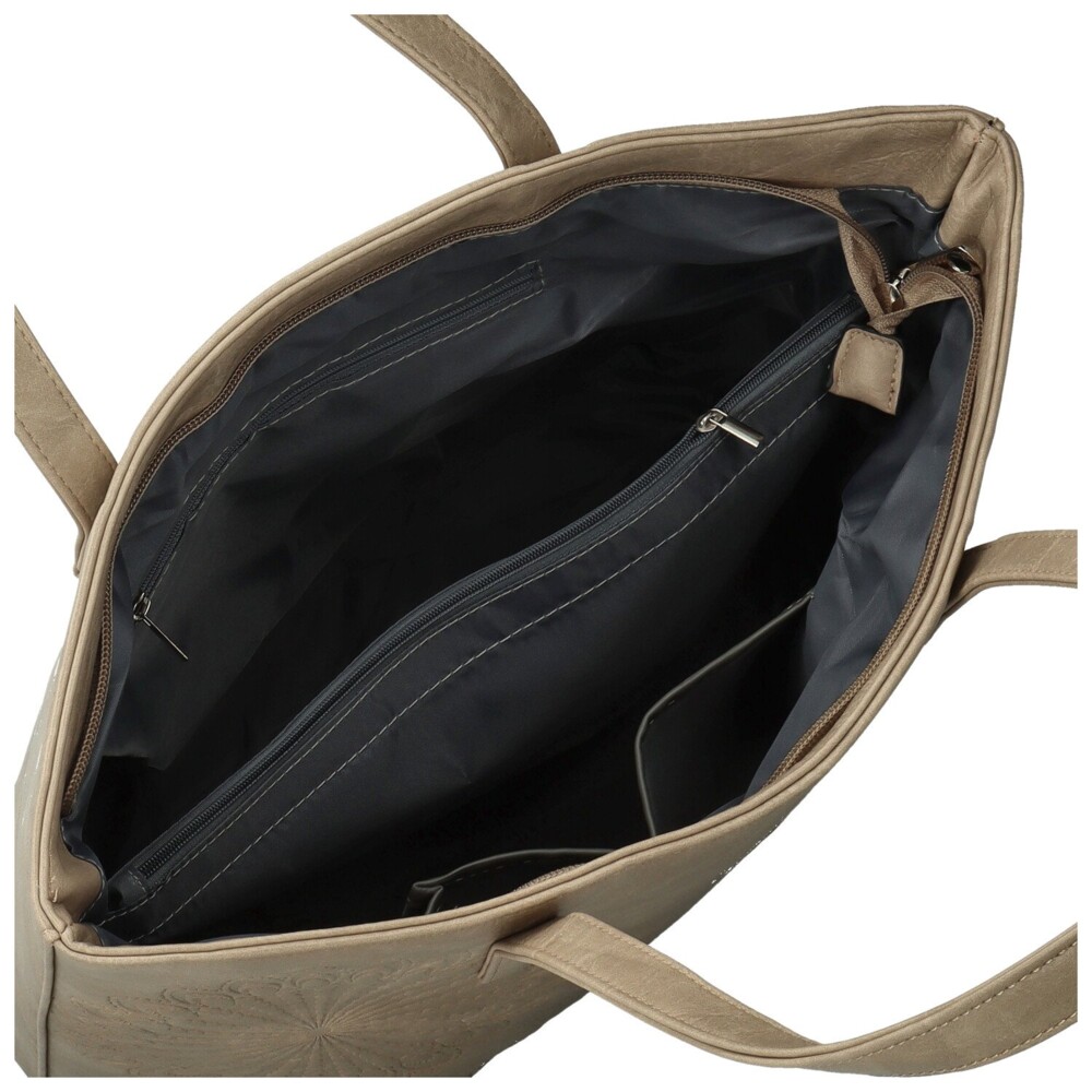 Tato velká kabelka z jemné koženky je ztělesněním jednoduché elegance s dotekem originality. Přední stranu zdobí nádherné vyšívané květinové motivy, které působí plasticky a dodávají kabelce jedinečný, ženský charakter. Díky dlouhým uchům ji můžete pohodlně nosit přes rameno i v ruce. Hlavní kapsa na zip ukrývá prostorný interiér se středovou zipovou kapsou, která dělí prostor na dvě části, a menší kapsičky v podšívce pro přehledné uspořádání všech drobností. Stříbrné kování podtrhuje její moderní vzhled a dokonale ladí s decentní barvou kabelky. Stylová, praktická a s nádechem originality. Objednejte ještě dnes a vyzkoušejte, vrátit ji můžete až do 30 dnů!