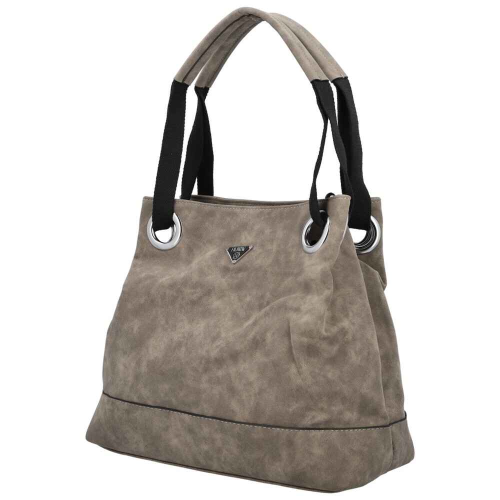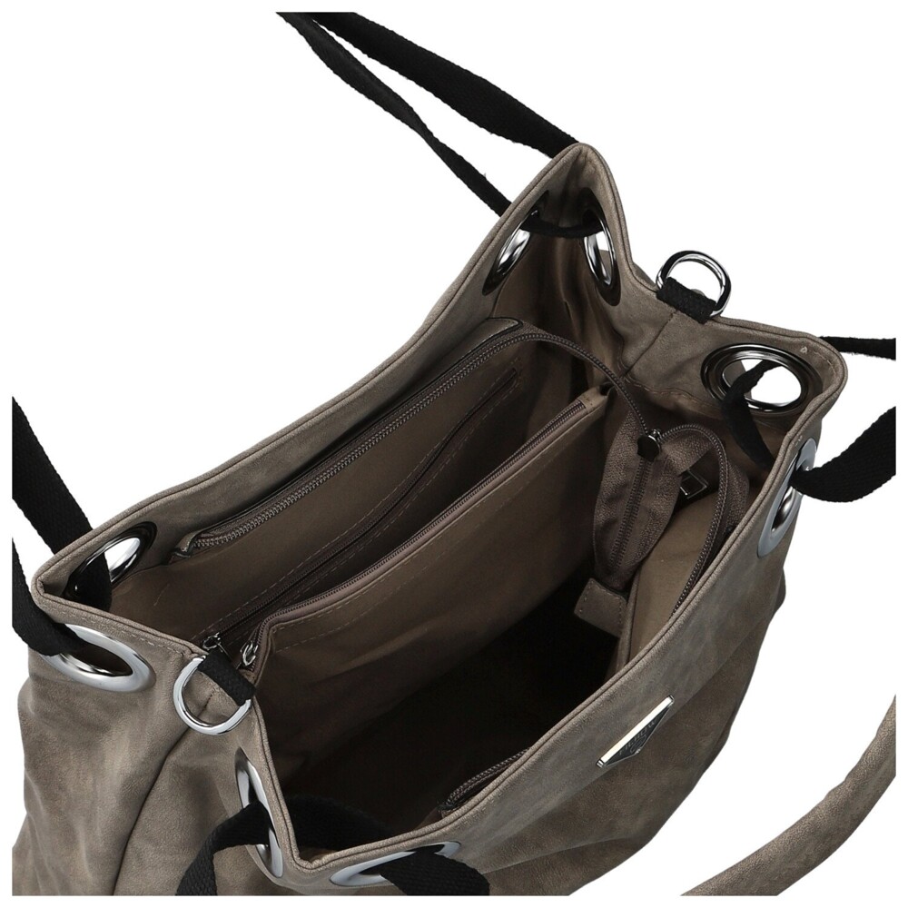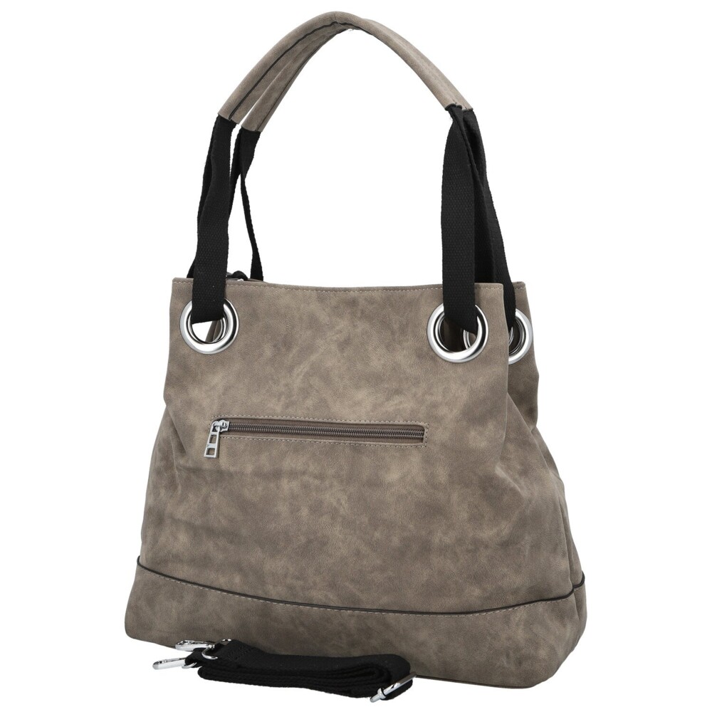 Tahle dámská koženková kabelka zaujme na první pohled svým měkkým tvarem a elegantně ležérním vzhledem. Na přední straně nechybí decentní kovové logo, které spolu se stříbrnými očky vytváří výrazný, ale pořád vkusný detail. Široká textilní ucha procházejí velkými kovovými průvleky, díky čemuž kabelka krásně padne na rameno a zároveň získává zajímavý designový prvek. Na zadní straně je ukrytá praktická zipová kapsa. Hlavní kapsa je zajištěna zipem a uvnitř vás čeká přehledné uspořádání, kapsičky v podšívce i středová zipová část. Pro maximální pohodlí je tu navíc dlouhý textilní popruh na připnutí, díky kterému můžete kabelku nosit i jako crossbody. Stříbrné kování krásně doladí její svěží, moderní vzhled. Objednejte ještě dnes a vyzkoušejte, vrátit ji můžete až do 30 dnů!
