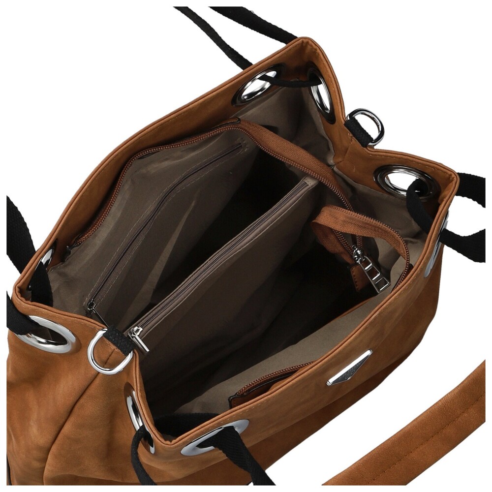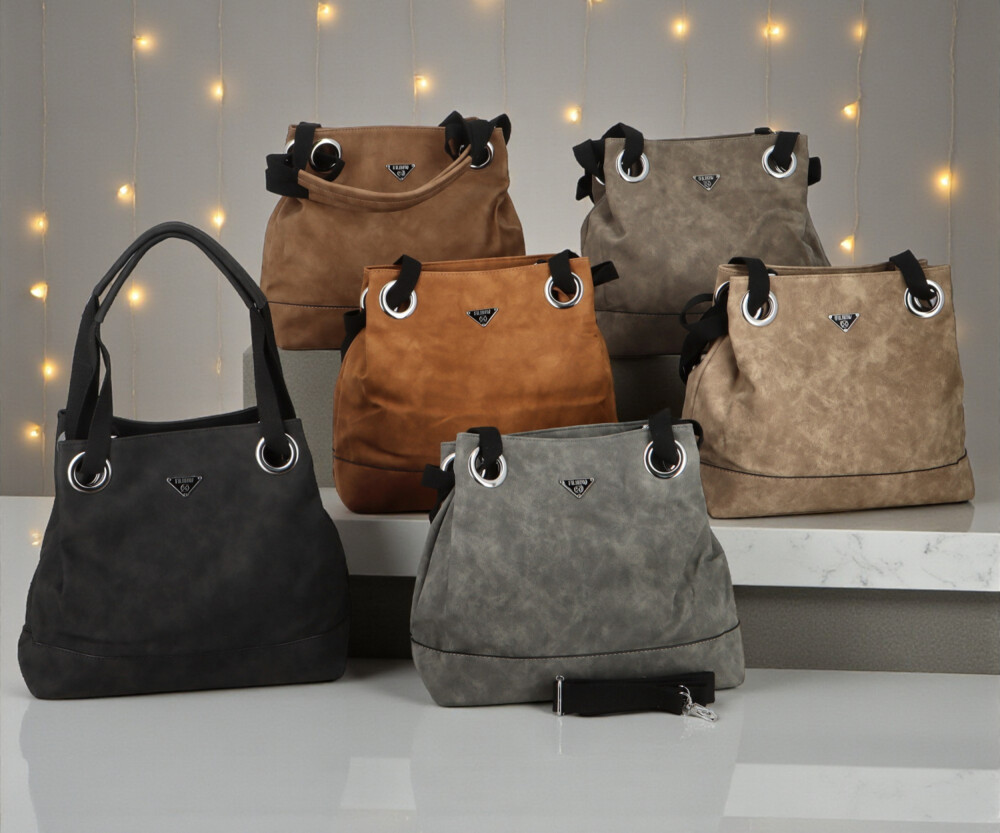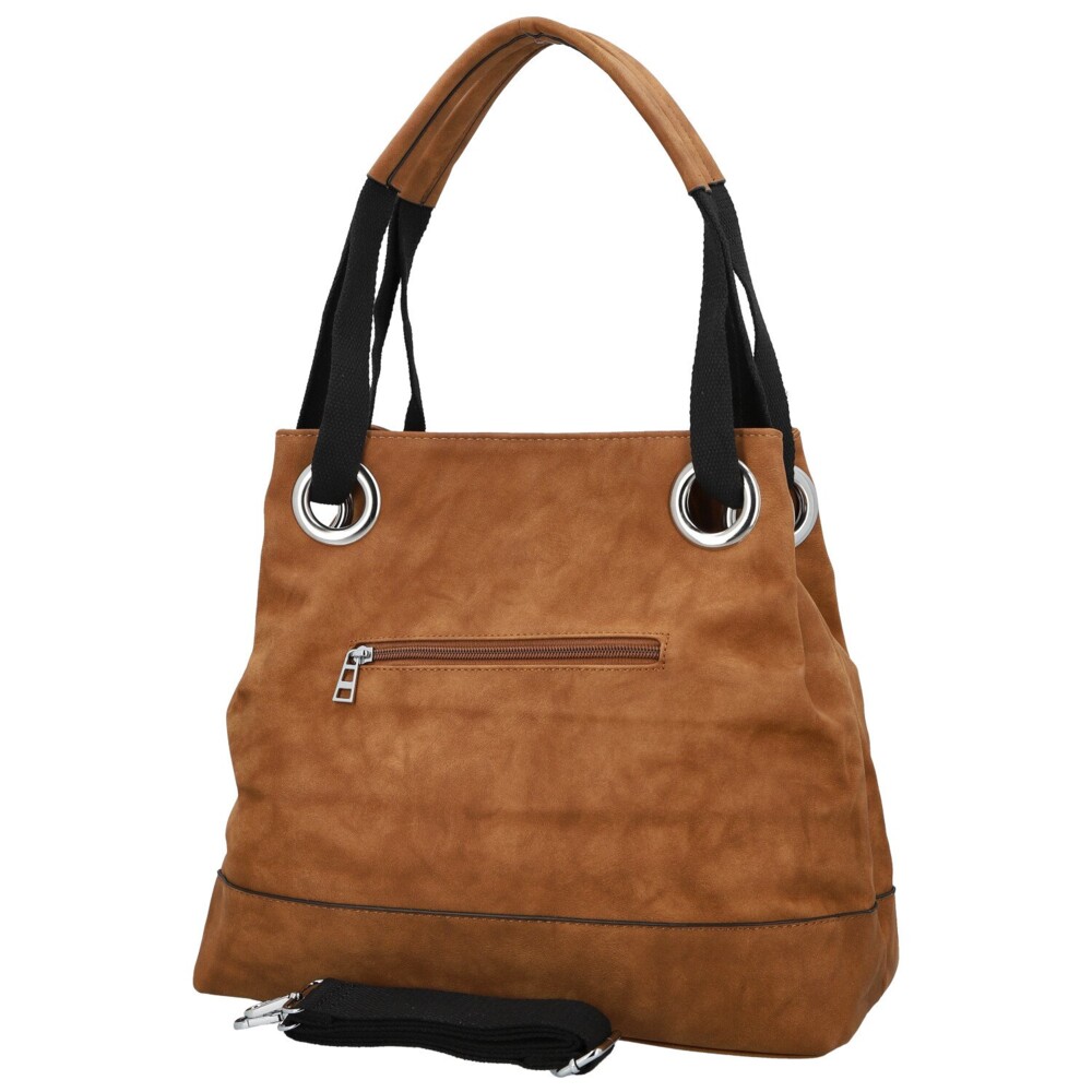 Tahle dámská koženková kabelka zaujme na první pohled svým měkkým tvarem a elegantně ležérním vzhledem. Na přední straně nechybí decentní kovové logo, které spolu se stříbrnými očky vytváří výrazný, ale pořád vkusný detail. Široká textilní ucha procházejí velkými kovovými průvleky, díky čemuž kabelka krásně padne na rameno a zároveň získává zajímavý designový prvek. Na zadní straně je ukrytá praktická zipová kapsa. Hlavní kapsa je zajištěna zipem a uvnitř vás čeká přehledné uspořádání, kapsičky v podšívce i středová zipová část. Pro maximální pohodlí je tu navíc dlouhý textilní popruh na připnutí, díky kterému můžete kabelku nosit i jako crossbody. Stříbrné kování krásně doladí její svěží, moderní vzhled. Objednejte ještě dnes a vyzkoušejte, vrátit ji můžete až do 30 dnů!