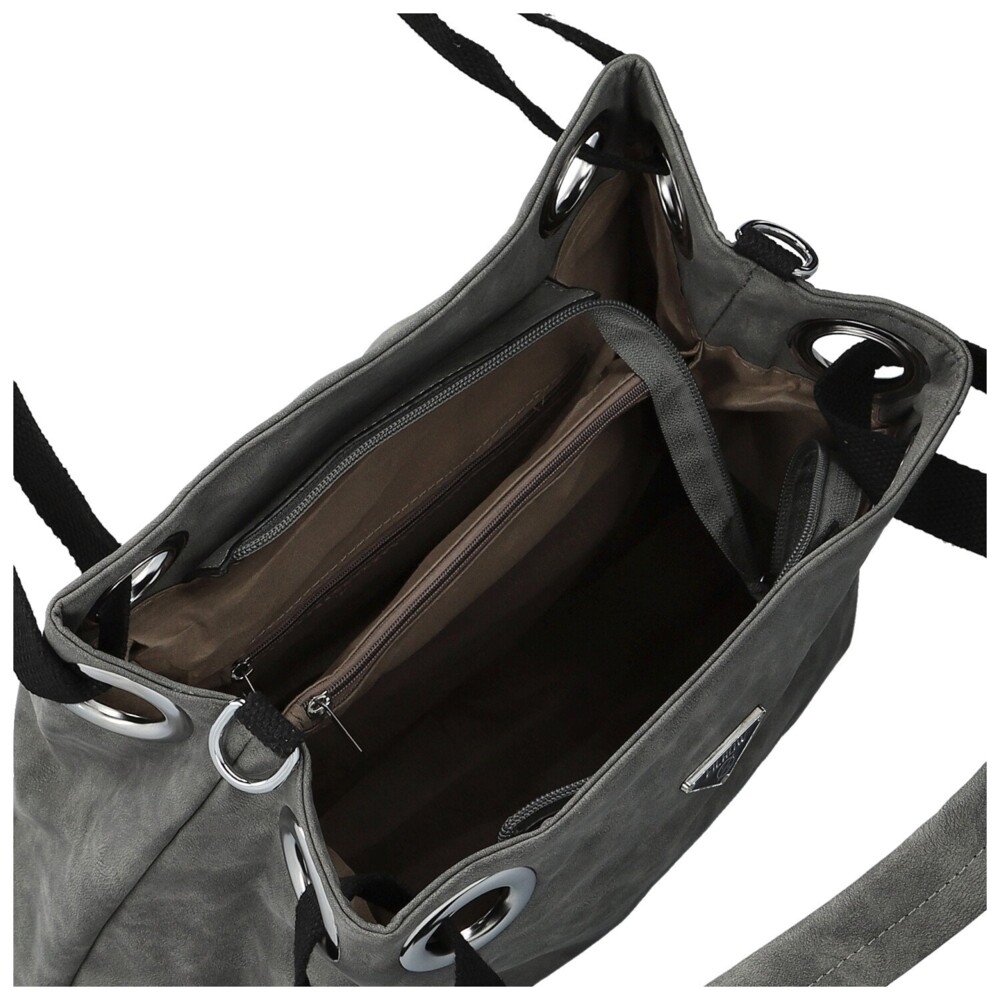 Tahle dámská koženková kabelka zaujme na první pohled svým měkkým tvarem a elegantně ležérním vzhledem. Na přední straně nechybí decentní kovové logo, které spolu se stříbrnými očky vytváří výrazný, ale pořád vkusný detail. Široká textilní ucha procházejí velkými kovovými průvleky, díky čemuž kabelka krásně padne na rameno a zároveň získává zajímavý designový prvek. Na zadní straně je ukrytá praktická zipová kapsa. Hlavní kapsa je zajištěna zipem a uvnitř vás čeká přehledné uspořádání, kapsičky v podšívce i středová zipová část. Pro maximální pohodlí je tu navíc dlouhý textilní popruh na připnutí, díky kterému můžete kabelku nosit i jako crossbody. Stříbrné kování krásně doladí její svěží, moderní vzhled. Objednejte ještě dnes a vyzkoušejte, vrátit ji můžete až do 30 dnů!