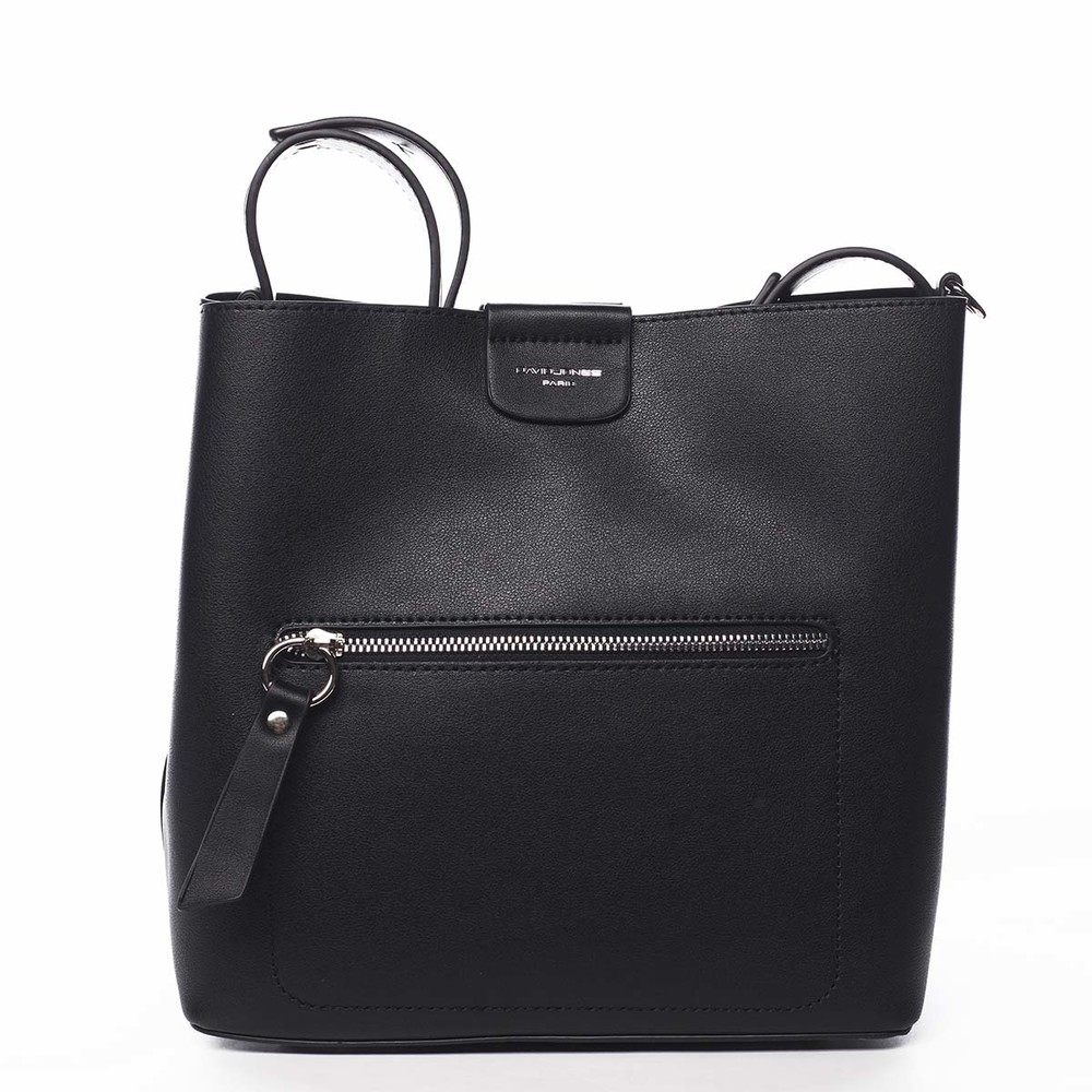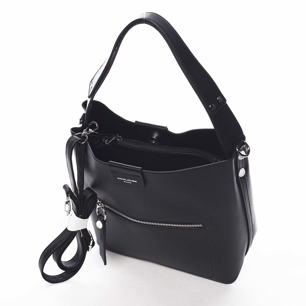 Luxusní a velmi módní kabelka od značky David Jones má černou barvu, nosí se přes rameno a rozhodně Vás zaujme na první pohled. Objednejte ještě dnes a vyzkoušejte, vrátit ji můžete až za 30 dnů! Elegantní kabelka má moderní vzhled, měkké stěny a pevné dno, které je opatřeno kovovými cvočky, při pokládání se tedy neušpiní a neodře. K dispozici máte ucho kabelky i odnímatelný popruh. Hlavní kapsa se zapíná magnetickým cvokem, tu dělí kapsička se zipem na dvě části. Vnitřní prostor je zjednodušený, bez podšívky, ale je zde dostatek místa pro vaše osobní i další věci. Drobnosti nebo telefon můžete mít ve přední kapse se zipem, její jezdec má polokovový-syntetický design. Věříme, že s touto kráskou naděláte mnoho parády ve městě, při posezení u vínka i ve společnosti :)