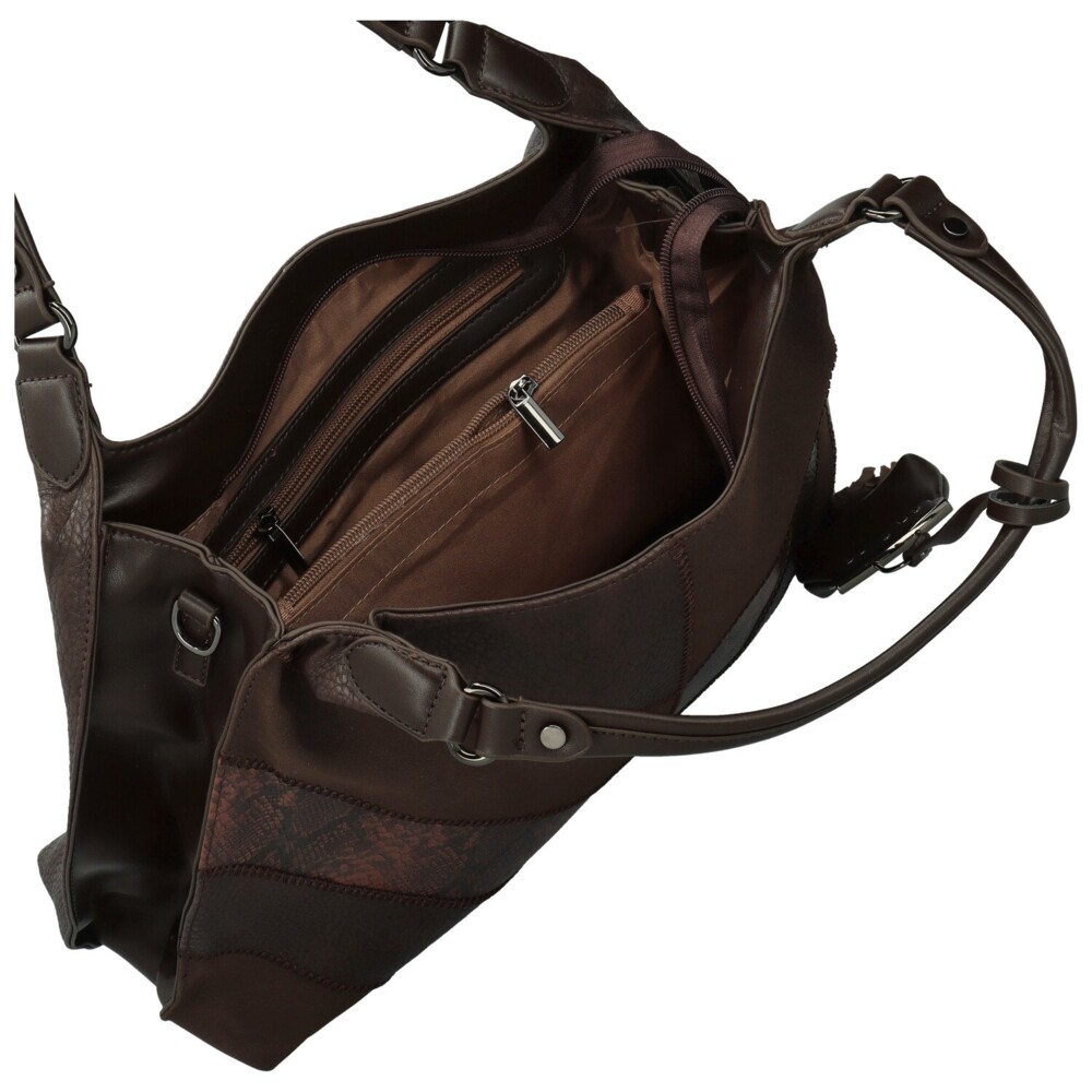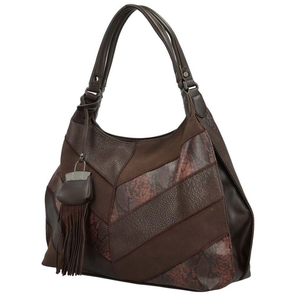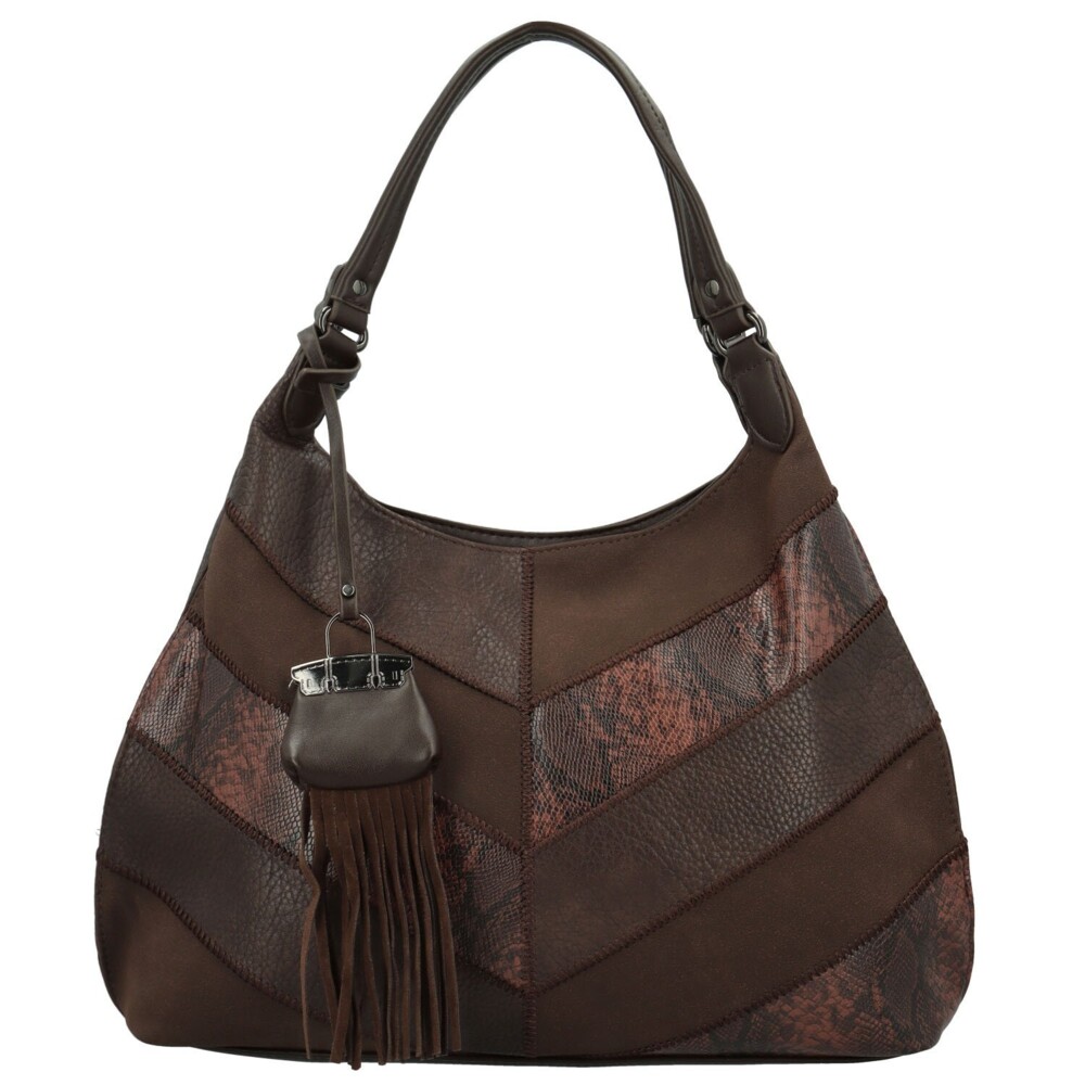 Originální dámská kabelka z koženky, která zaujme hned na první pohled. Přední stranu zdobí netradiční kombinace šikmých pruhů v různých površích a odstínech, nechybí ani hadí vzor, který dodává celému modelu šmrnc. Stylový přívěsek s třásněmi podtrhuje moderní vzhled. Zadní strana je v jednobarevném provedení a nabízí praktickou zipovou kapsičku. Kabelka má dvě pevná ucha pro nošení v ruce nebo na rameni a také dlouhý nastavitelný popruh, který lze připnout pro pohodlné crossbody nošení. Hlavní kapsa je na zip a uvnitř kapsičky v podšívce a středová zipová kapsa pro lepší organizaci vašich drobností. Elegantní doplněk s originálním designem a praktickým řešením. Objednejte ještě dnes a vyzkoušejte, vrátit ji můžete až do 30 dnů!