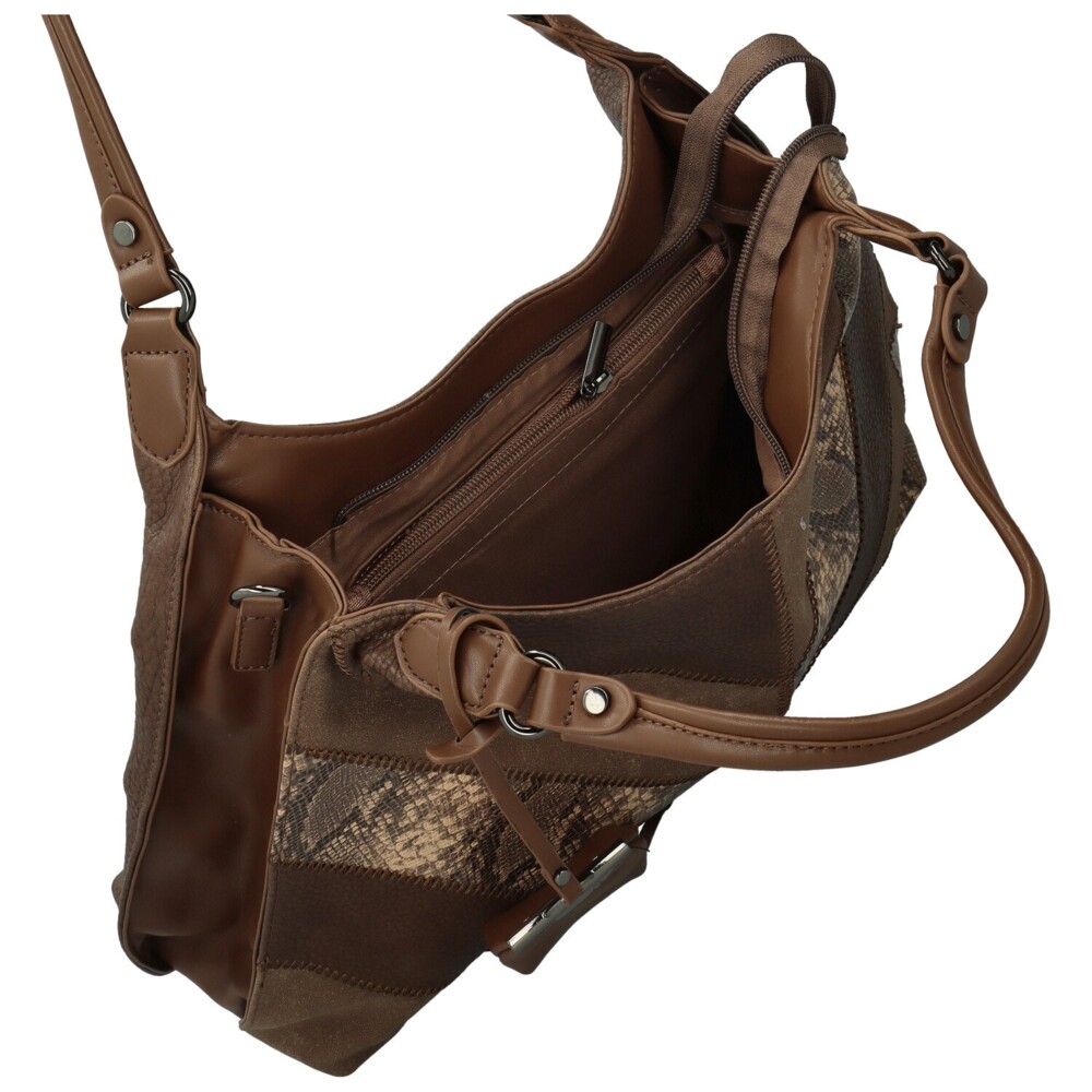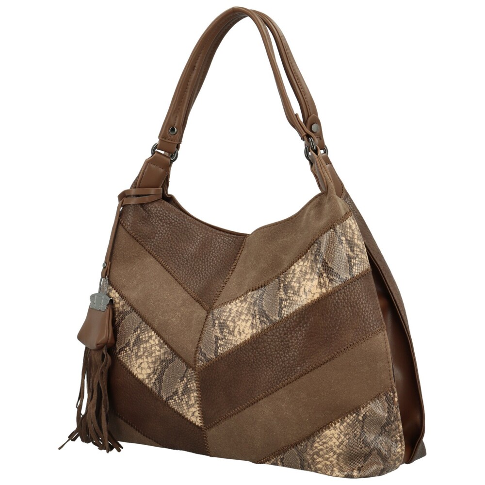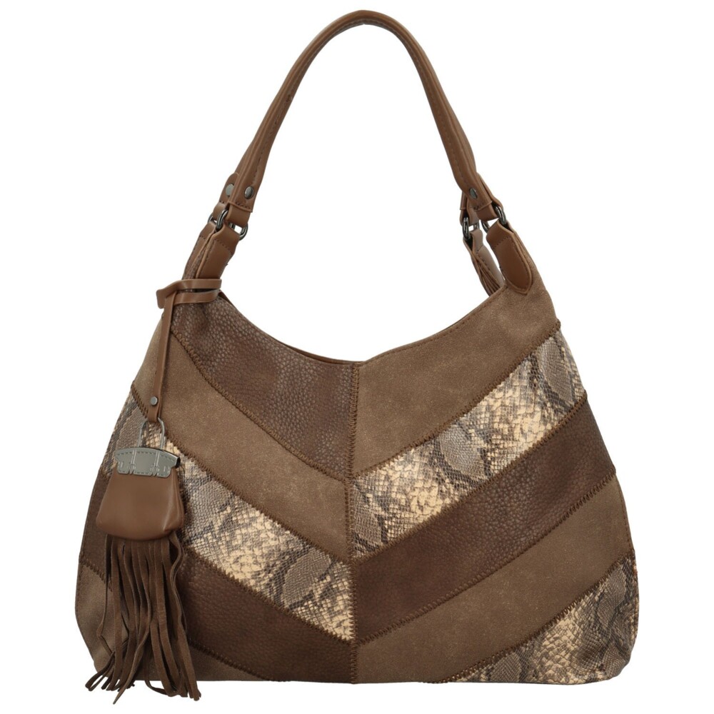 Originální dámská kabelka z koženky, která zaujme hned na první pohled. Přední stranu zdobí netradiční kombinace šikmých pruhů v různých površích a odstínech, nechybí ani hadí vzor, který dodává celému modelu šmrnc. Stylový přívěsek s třásněmi podtrhuje moderní vzhled. Zadní strana je v jednobarevném provedení a nabízí praktickou zipovou kapsičku. Kabelka má dvě pevná ucha pro nošení v ruce nebo na rameni a také dlouhý nastavitelný popruh, který lze připnout pro pohodlné crossbody nošení. Hlavní kapsa je na zip a uvnitř kapsičky v podšívce a středová zipová kapsa pro lepší organizaci vašich drobností. Elegantní doplněk s originálním designem a praktickým řešením. Objednejte ještě dnes a vyzkoušejte, vrátit ji můžete až do 30 dnů!