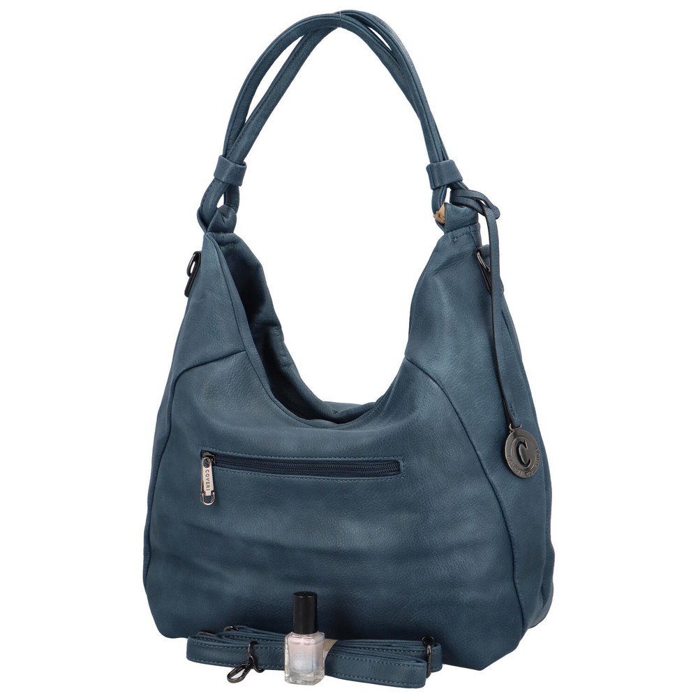 Módní syntetická kabelka s odnímatelným popruhem od značky Coveri World. Středně velká kabelka do města nebo na nákupy nabízí klasickou hlavní kapsu s postranními kapsičkami na drobnosti a cennosti a navíc je rozdělena na dvě části a to pomocí látkové kapsy se zipem. Kabelka je měkká a modrá. Součástí je odnímatelný kovový přívěsek.