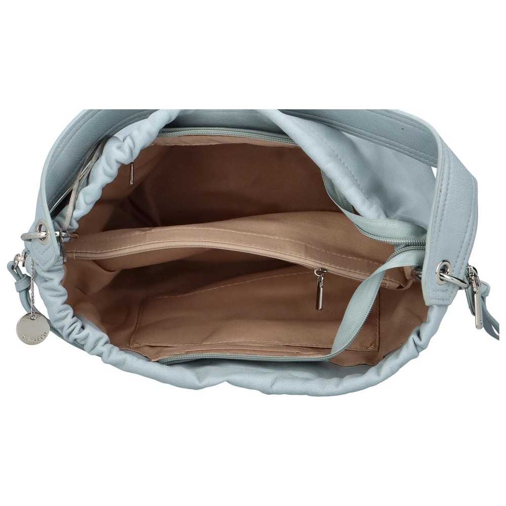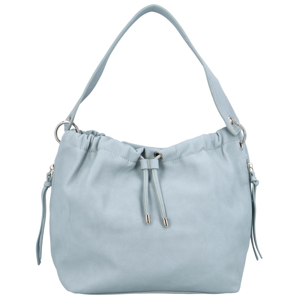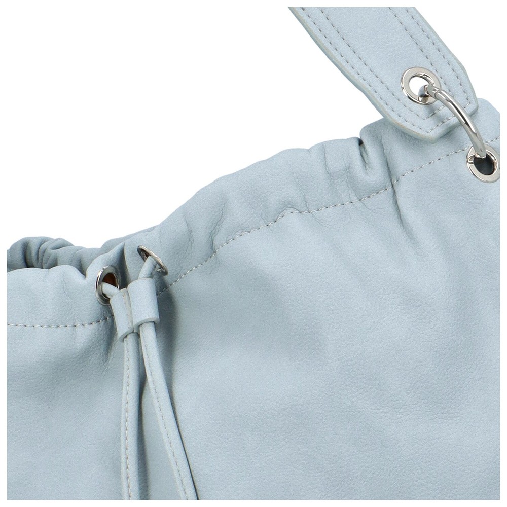 Luxusní městská novinka ze syntetiky, od oblíbené značky DIANA & CO. Středně velká lehce bledě modrá kabelka pro ženy. Objednejte ještě dnes a vyzkoušejte, vrátit ji můžete až za 30 dnů! Kabelku budete nosit přes rameno za ucho nebo s popruhem. Bonusem je malý kovový přívěsek s logem značky a originálně umístěné zipy na bocích kabelky. Hlavní kapsa se zde zapíná zipem, ale lze ji stáhnout také pomocí šňůrky, která kabelce dodává na luxusu. Vnitřní část je rozdělena látkovou přepážkou ve formě kapsy na zip. Chybět Vám nebude volná kapsa na telefon nebo kapsička se zipem na drobnosti. Celkově je kabelka měkká s pevnějším dnem.