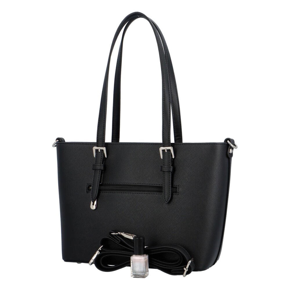 Objednejte ještě dnes a vyzkoušejte, vrátit ji můžete až za 30 dnů! Krásné kabelky s elegantním vzhledem - to je FLORA&CO. Černá kabelka přes rameno je středně velká a má vzor saffiano. Jedná se o pevný model s pevným dnem a kovovými cvoky na spodní straně. Otevírá se zipem, vnitřní prostor se dělí na dvě hlavní úložiště a to prostřednictvím kapsy se zipem. Na přední straně je bonusem kovový článek, ke kterému lze připnout jakýkoliv přívěsek.
