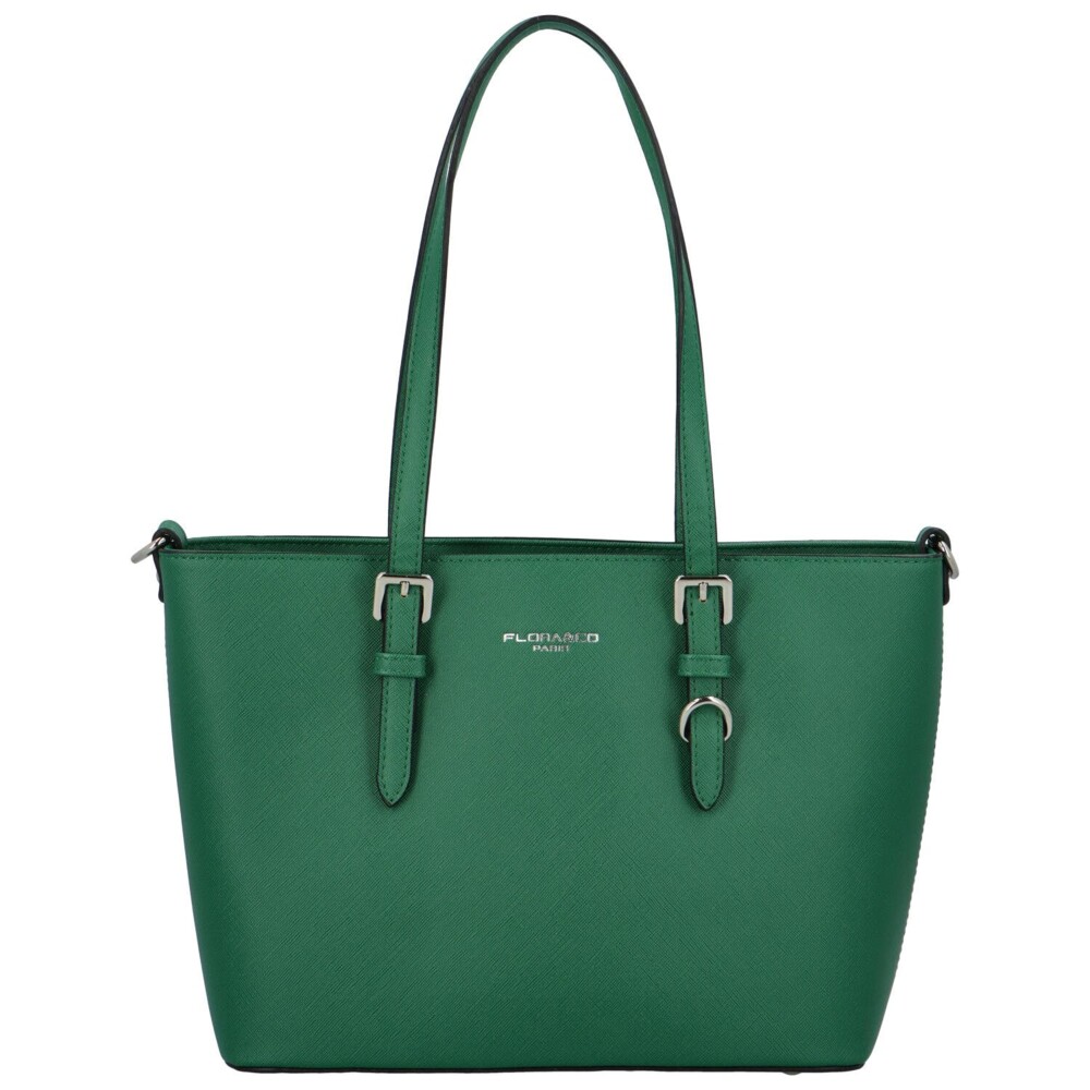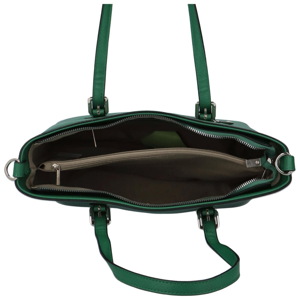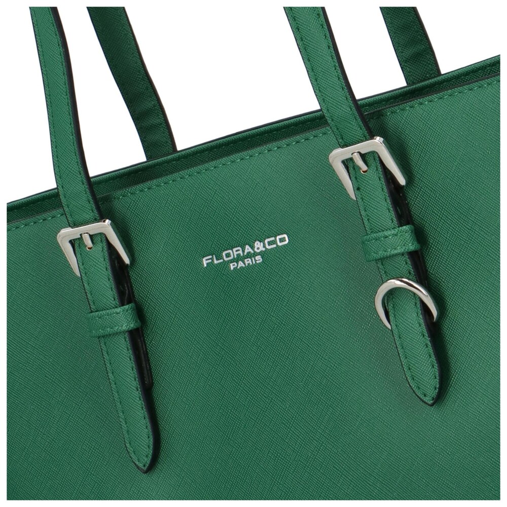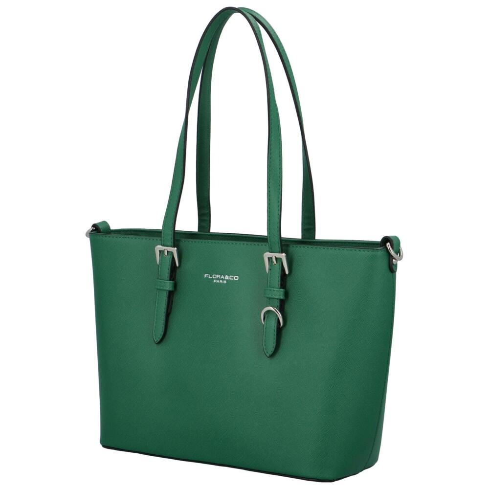 Objednejte ještě dnes a vyzkoušejte, vrátit ji můžete až za 30 dnů! Krásné kabelky s elegantním vzhledem - to je FLORA&CO. Tmavě zelená kabelka přes rameno je středně velká a má vzor saffiano. Jedná se o pevný model s pevným dnem a kovovými cvoky na spodní straně. Otevírá se zipem, vnitřní prostor se dělí na dvě hlavní úložiště a to prostřednictvím kapsy se zipem. Na přední straně je bonusem kovový článek, ke kterému lze připnout jakýkoliv přívěsek.