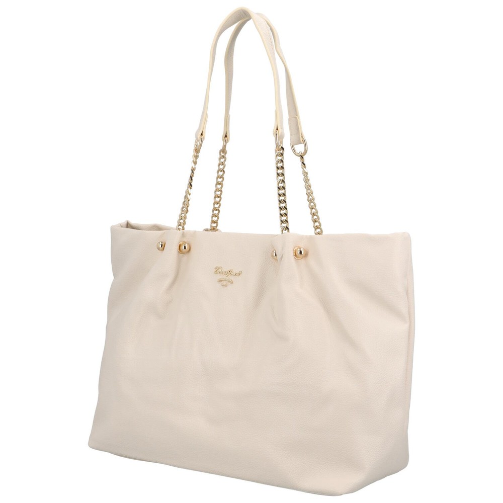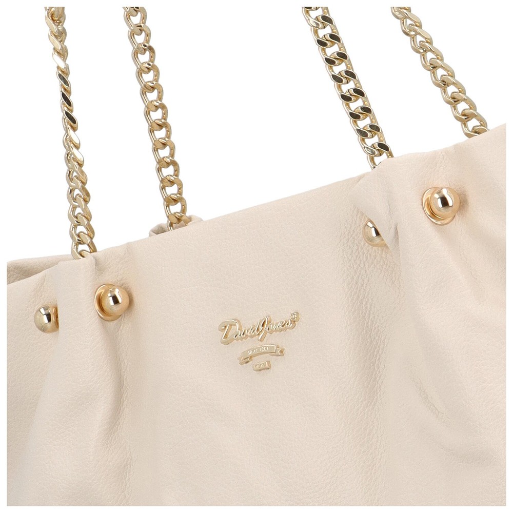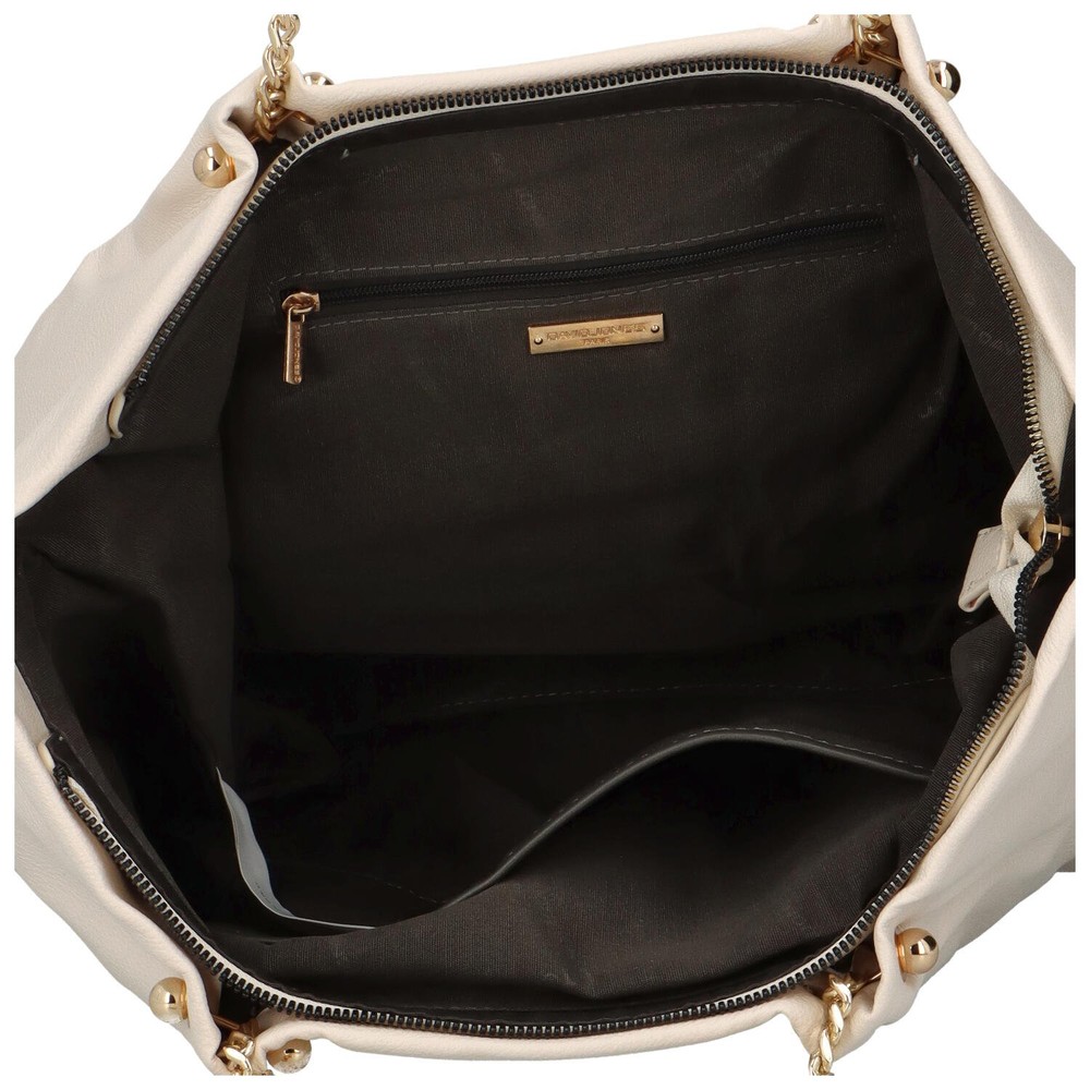 Velká módní kabelka pro ženy od značky David Jones. Prostor Vám u této světle béžové měkké krásky rozhodně chybět nebude. Doplní Váš outfit ve městě, na nákupech, ale i v práci. Nosit ji lze přes rameno za dlouhé uši, které jsou částečně ze syntetiky a částečně z kovových kroužků. Neváhejte a objednejte si úžasnou kabelku! Vrátit ji můžete až za 30 dnů! Hlavní kapsa se otevírá zipem, prostor kabelky je opravdu velký a chybět Vám zde nebudou klasické volné kapsičky i kapsa se zipem.