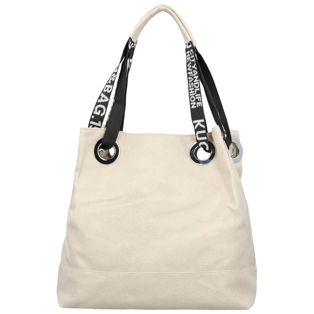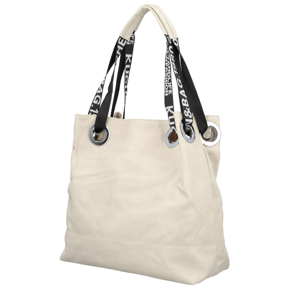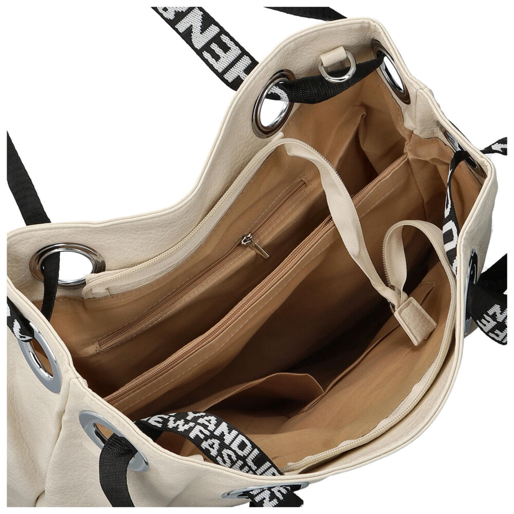 Středně velká dámská shopper kabelka v moderním designu s hlavní kapsou na zip. Objednejte ještě dnes a vyzkoušejte, vrátit ji můžete až za 30 dnů! Kabelka není jen doplněk. Je to váš každodenní společník, který vás doprovází na cestách, v práci i při setkáních s přáteli. Vyberte si model, který vystihne vaši osobnost – jemný, výrazný, elegantní a zároveň ležérní. Světle béžová kabelka přes rameno Firenze. Nabídne dostatečný prostor na veškeré osobní věci i dálší potřeby jako jsou knihy, diář, notebook, šálu, občerstvení. Dlouhé uši jsou z polyesteru a prostřední části jsou polstrované syntetickou kůží, bude se vám tak nosit pohodlně v ruce i přes rameno. Vnitřní část je rozdělena přihrádkou se zipem. Samozřejmostí jsou malé kapsičky na kosmetiku, telefon a další drobnosti.
