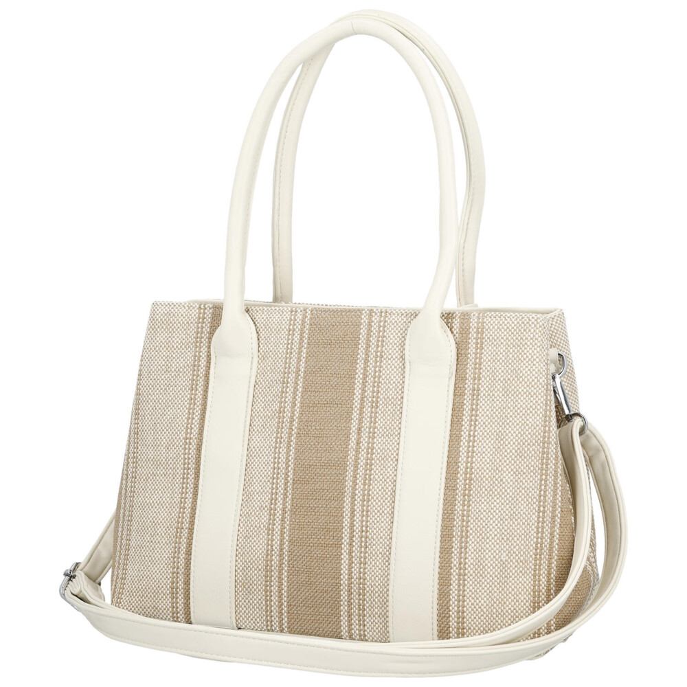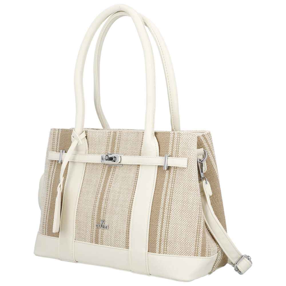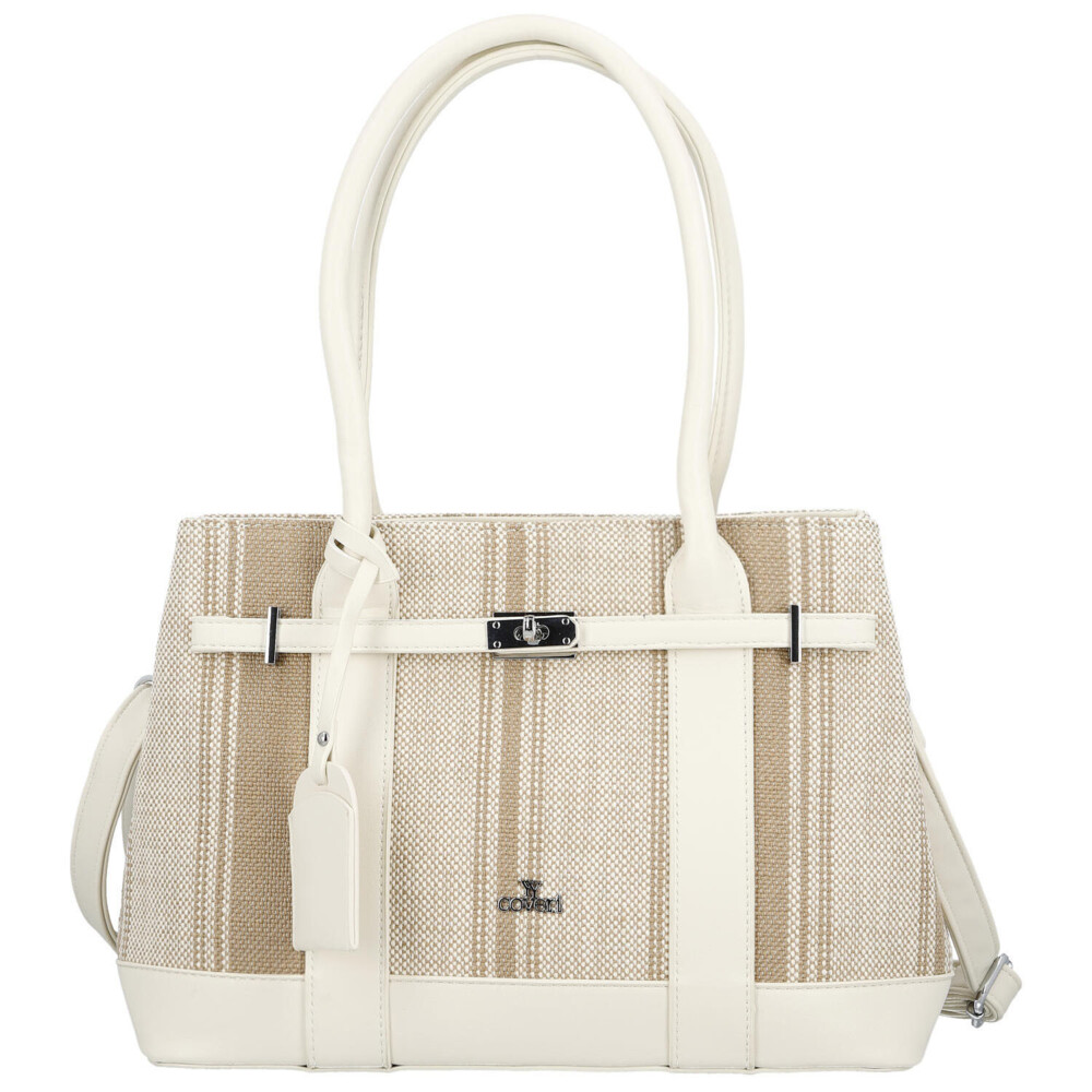 Elegantní dámská kabelka, od značky Coveri, v jemném tmavě béžovém provedení kombinuje moderní design s městskou inspirací, čehož si všimnete hned na přední straně. Vzor textilu s decentním proužkem dodává syntetické kabelce svěží a lehký vzhled, ideální pro jarní a letní sezónu. Pevnější zakulacené uši umožňují pohodlné nošení na předloktí, zatímco odnímatelný a nastavitelný popruh nabízí možnost nošení přes rameno. Kabelka disponuje dostatečně prostorným interiérem pro každodenní potřeby, dva prostory oddělené kapsičkou na zip, a díky hlavnímu zapínání na zip zůstanou vaše věci bezpečně uložené. Stylové detaily, jako jsou kovové prvky a ozdobný pásek, podtrhují elegantní charakter tohoto modelu. Perfektní volba pro ženy, které hledají spojení praktičnosti a nadčasového stylu. Celkově je kabelka pevnější, dobře drží tvar a bonusem je přívěsek na uchu kabelky. Tak objednejte ještě dnes a vyzkoušejte, vrátit ji můžete do 30 dnů.