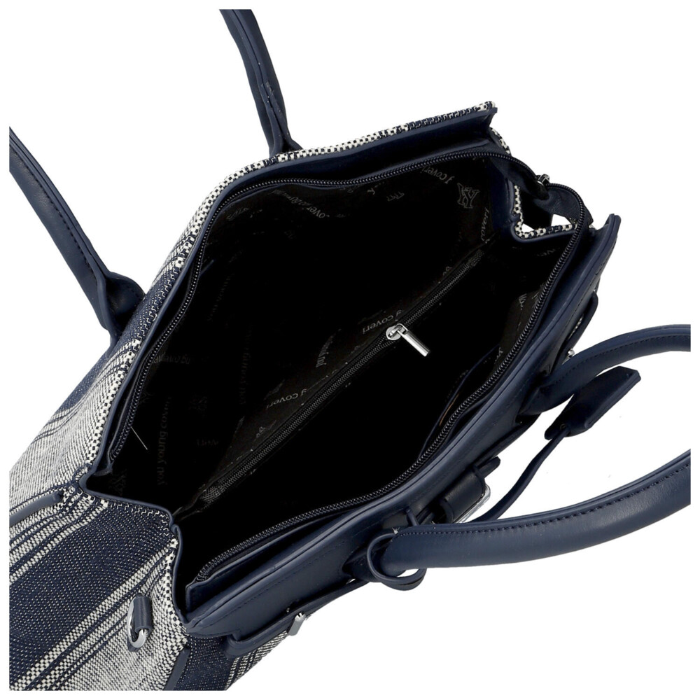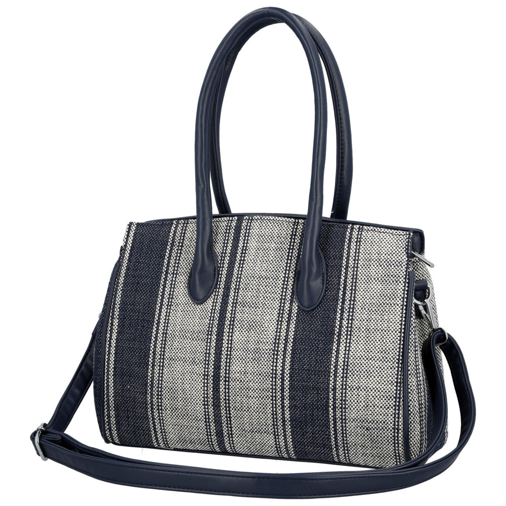 Elegantní dámská kabelka, od značky Coveri, v jemném tmavě modrém provedení kombinuje moderní design s městskou inspirací, čehož si všimnete hned na přední straně. Vzor textilu s decentním proužkem dodává syntetické kabelce svěží a lehký vzhled, ideální pro jarní a letní sezónu. Pevnější zakulacené uši umožňují pohodlné nošení na předloktí, zatímco odnímatelný a nastavitelný popruh nabízí možnost nošení přes rameno. Kabelka disponuje dostatečně prostorným interiérem pro každodenní potřeby, dva prostory oddělené kapsičkou na zip, a díky hlavnímu zapínání na zip zůstanou vaše věci bezpečně uložené. Stylové detaily, jako jsou kovové prvky a ozdobný pásek, podtrhují elegantní charakter tohoto modelu. Perfektní volba pro ženy, které hledají spojení praktičnosti a nadčasového stylu. Celkově je kabelka pevnější, dobře drží tvar a bonusem je přívěsek na uchu kabelky. Tak objednejte ještě dnes a vyzkoušejte, vrátit ji můžete do 30 dnů.