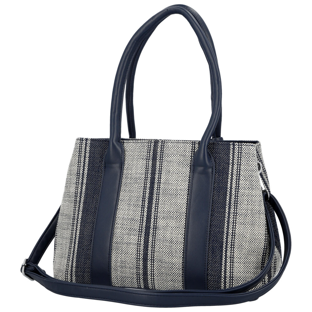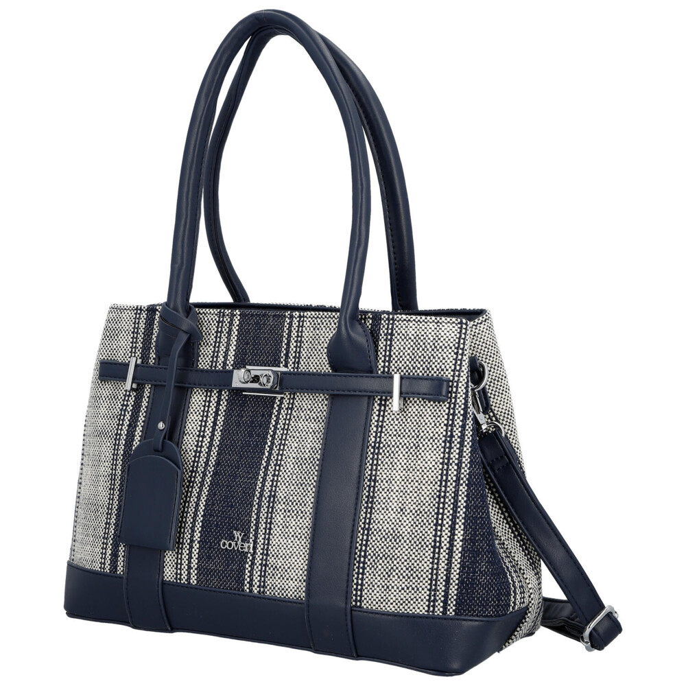 Elegantní dámská kabelka, od značky Coveri, v jemném tmavě modrém provedení kombinuje moderní design s městskou inspirací, čehož si všimnete hned na přední straně. Vzor textilu s decentním proužkem dodává syntetické kabelce svěží a lehký vzhled, ideální pro jarní a letní sezónu. Pevnější zakulacené uši umožňují pohodlné nošení na předloktí, zatímco odnímatelný a nastavitelný popruh nabízí možnost nošení přes rameno. Kabelka disponuje dostatečně prostorným interiérem pro každodenní potřeby, dva prostory oddělené kapsičkou na zip, a díky hlavnímu zapínání na zip zůstanou vaše věci bezpečně uložené. Stylové detaily, jako jsou kovové prvky a ozdobný pásek, podtrhují elegantní charakter tohoto modelu. Perfektní volba pro ženy, které hledají spojení praktičnosti a nadčasového stylu. Celkově je kabelka pevnější, dobře drží tvar a bonusem je přívěsek na uchu kabelky. Tak objednejte ještě dnes a vyzkoušejte, vrátit ji můžete do 30 dnů.