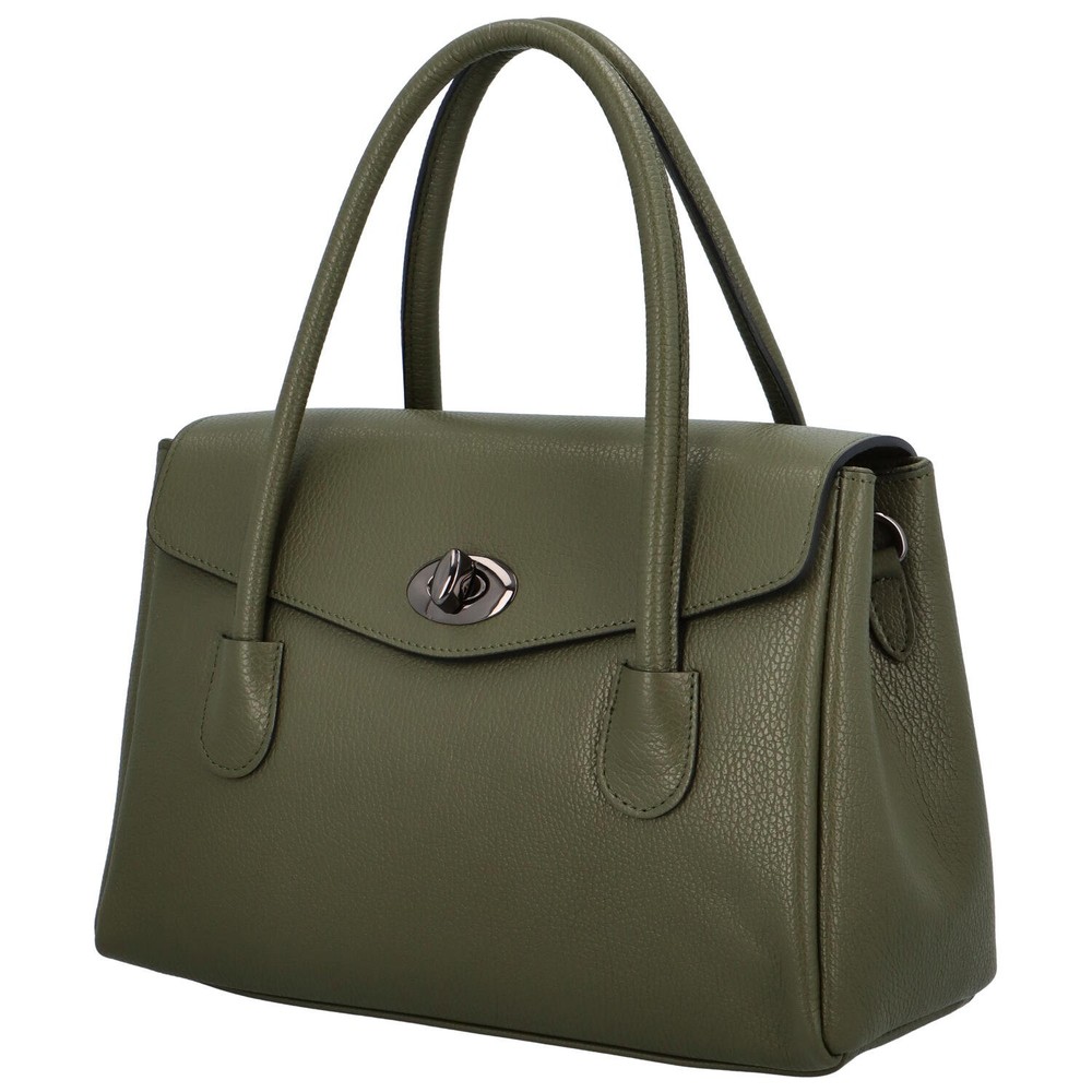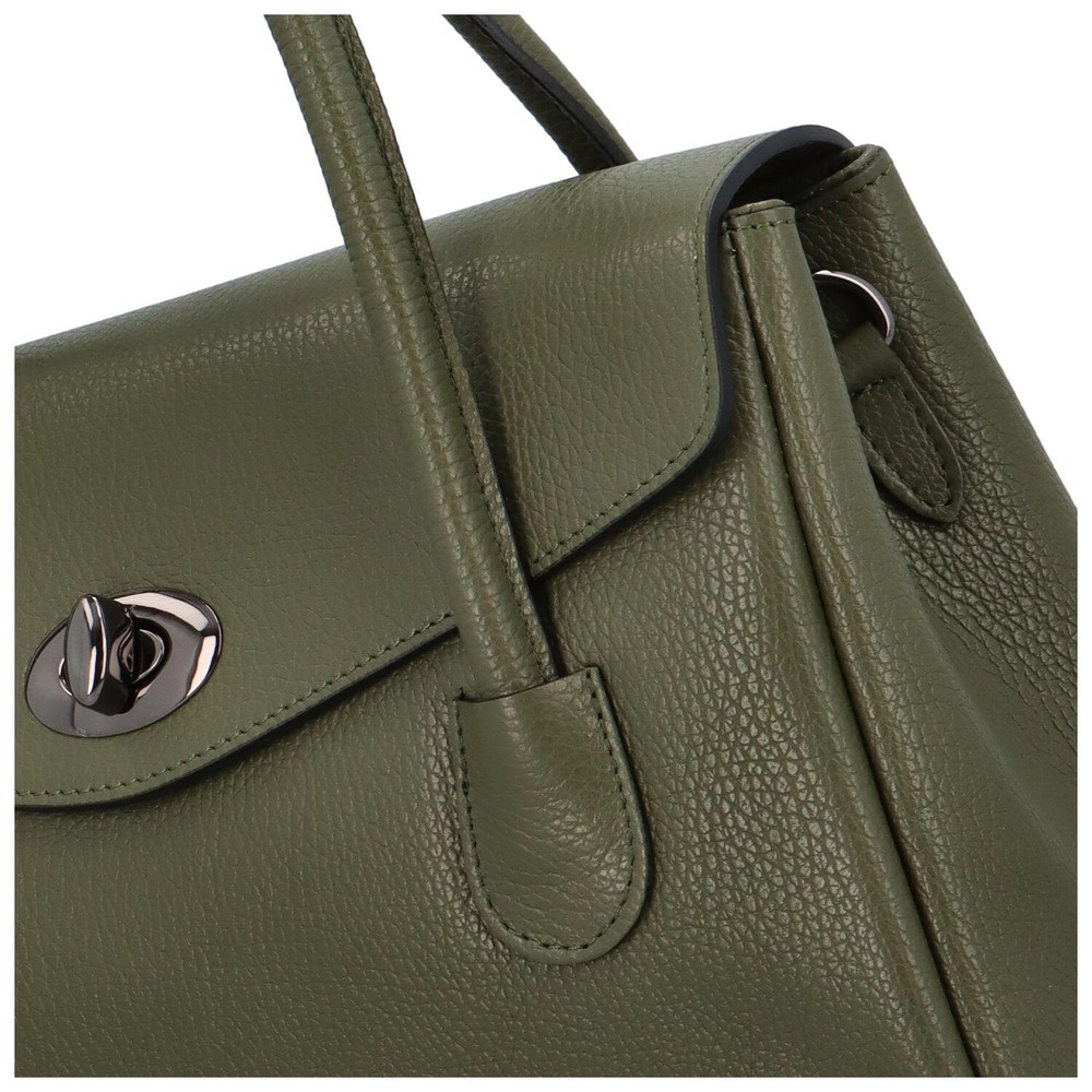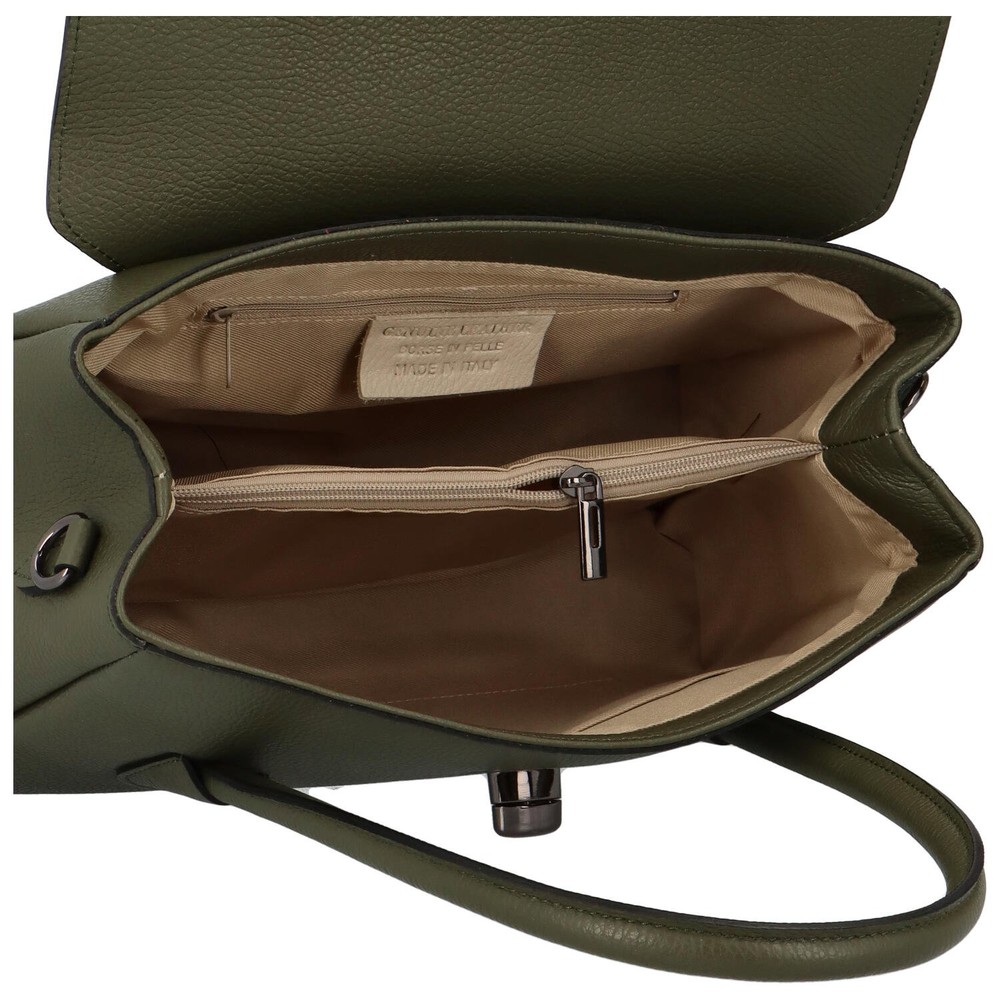 Originální a krásná kožená kabelka pro ženy s vkusem, od značky Delami Vera Pelle. Objednejte ještě dnes a vyzkoušejte, vrátit ji můžete až za 30 dnů! Lehce strukturovanou kabelku lze nosit v ruce, na předloktí nebo s popruhem přes rameno. Skvělý model, se kterým se sladíte do města i do společnosti. Khaki kabelka se otevírá krátkou klopou pomocí otočného (360°) kovového klipsu. Má pevnější konstrukci a na spodní straně jsou kovové cvočky. Hlavní kapsa je volná, uvnitř jsou dva hlavní prostory, které odděluje látková kapsa na zip. Samozřejmostí jsou menší kapsičky na telefon a drobnosti.