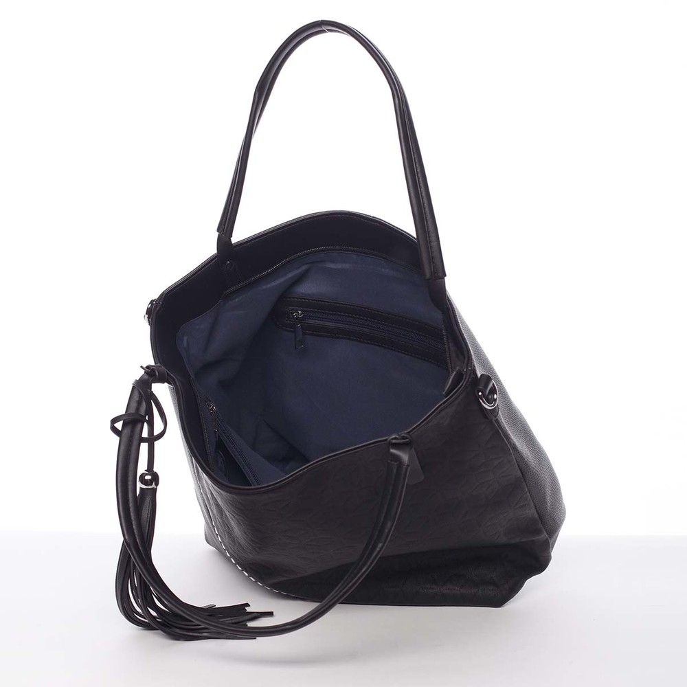 Velká dámská kabelka MARIA C. 2019 Ewa působí velmi elegantně. Využívat její společnosti můžete každý den, na cestě do práce, do města, na nákupech.. hodí se ženám, které mají rády svůj prostor a také vlastní hodně osobních a jiných věcí, které někam potřebují uložit. Rozhodně oživí Vaši osobnost. Zajímavou černou kabelku můžete nosit přes rameno díky delším uším nebo s popruhem, který lze nastavit na potřebnou délku. Kabelka je měkká, s pevnějším dnem, uvnitř prakticky rozdělena přepážkou v podobě kapsy se zipem. Dále má i menší kapsičky na cennosti a kosmetiku, potřebné osobní věci každý den. Bonusem je dlouhý odnímatelný přívěsek v podobě střapce. Objednejte ještě dnes a vyzkoušejte, vrátit ji můžete až za 30 dnů! Rozhodně oživí Vaši osobnost.