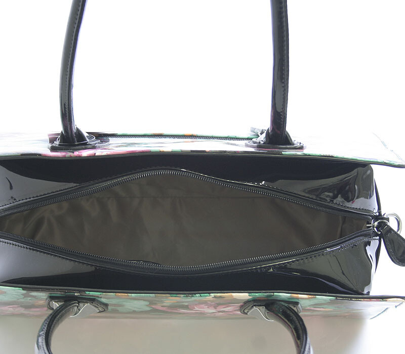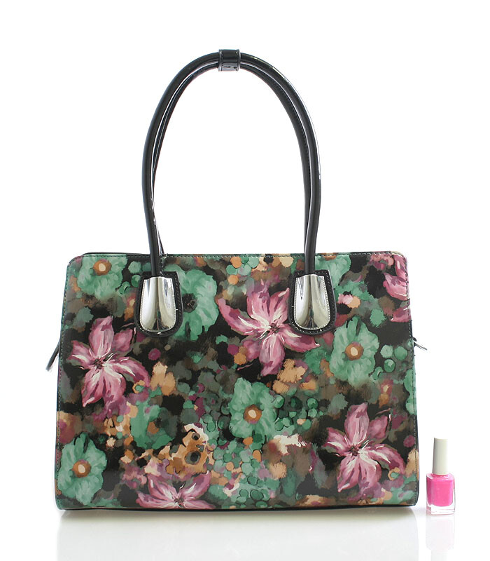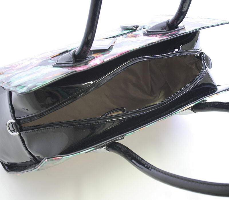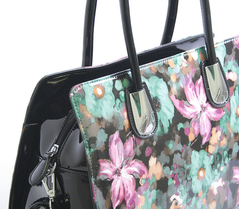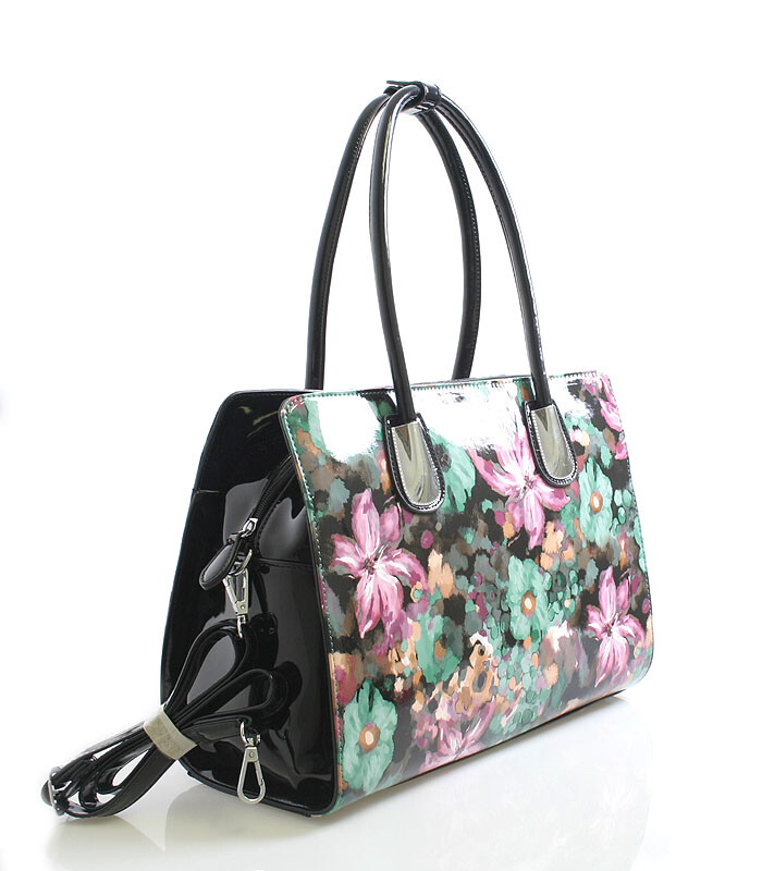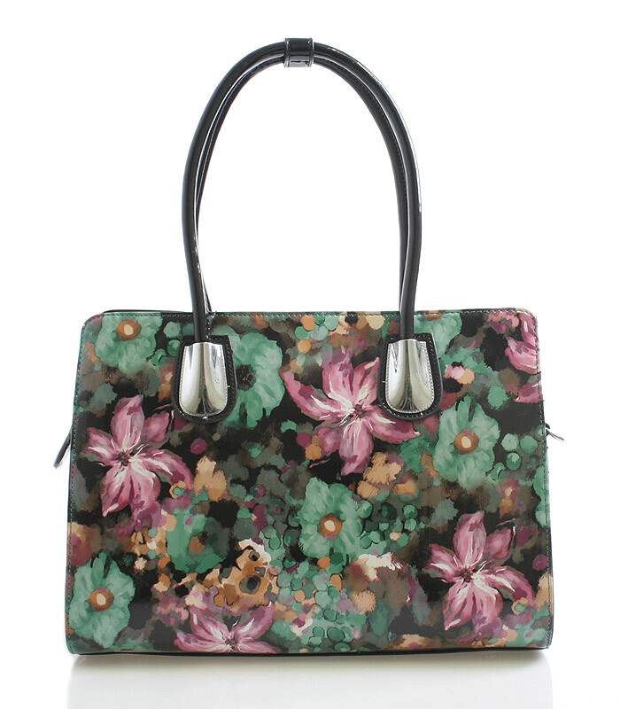 Zelená lakovaná kabelka Delami s motivem květin. Uvnitř je velký nedělený prostor, dále kapsa na zip a dvě menší bez zipu. Na zadní straně je menší kapsa na zip. Kabelku lze nosit v ruce nebo pohodlně přes rameno. Součástí je odnímatelný nastavitelný popruh. Kování je ve stříbrném provedení. Veselá jarní kabelka pro sezónu 2015.