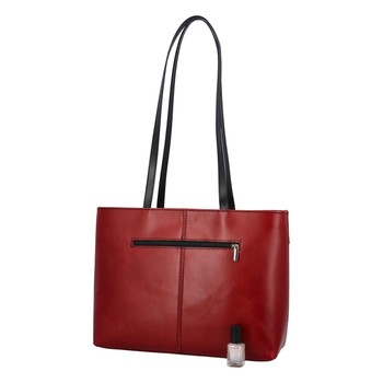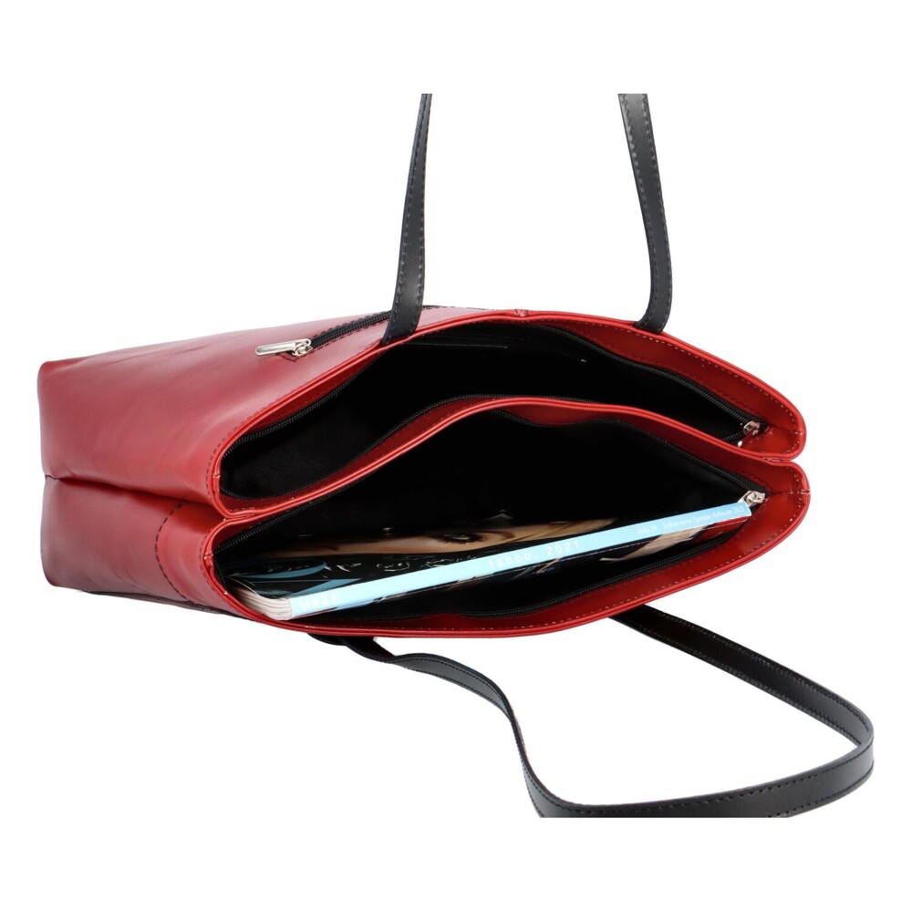 Střední kožená kabelka od značky ItalY v červené barvě je skvělým typem pro Váš outfit i šatník. Je skvělým doplňkem do divadla, do práce, do města i na vycházky. Její dno je pevnější, bude Vám jistě vyhovovat i po stránce prostoru. Má dvě hlavní kapsy, každá je zvlášť, vstup do nich je přes zipy. Uvnitř jedné z kapes je navíc menší kapsa na drobnosti se zipem. Detaily jsou v černé barvě. Objednejte ještě dnes a vyzkoušejte, vrátit ji můžete až za 30 dnů!