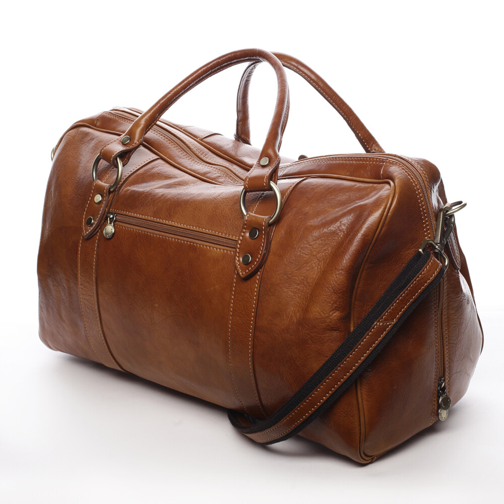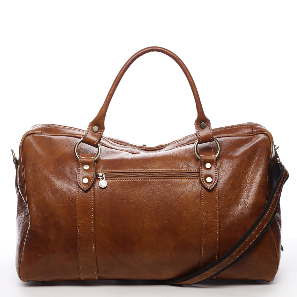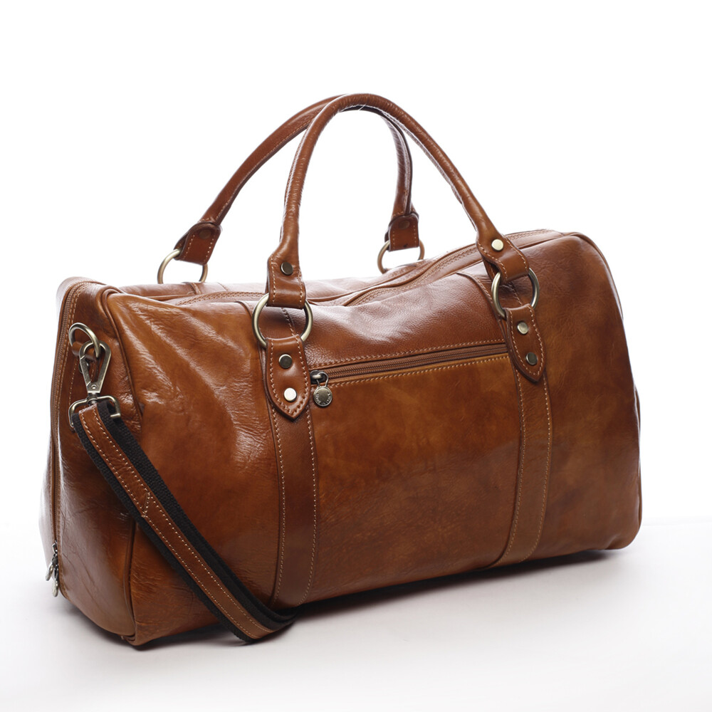 Kožená cestovní taška od značky Delami Vera Pelle. Elegantní a stylový kousek pro pohodlné cestování. Taška je kvalitní, z pevnějšího materiálu a velmi prostorná s odnímatelným popruhem přes rameno. Pevná ucha skvěle padnou do ruky. Je ušita z hovězí kůže, takže vám bude poctivě a dlouho sloužit. Na dvou vnějších stranách nabízí dvě kapsy se zipem a uvnitř využijete jednu velkou kapsu volnou a jednu se zipem. Dno chrání kovové nožičky a mosazné kování doladí tento luxusní kousek. Objednejte ještě dnes a vyzkoušejte, vrátit ji můžete až za 30 dnů!
