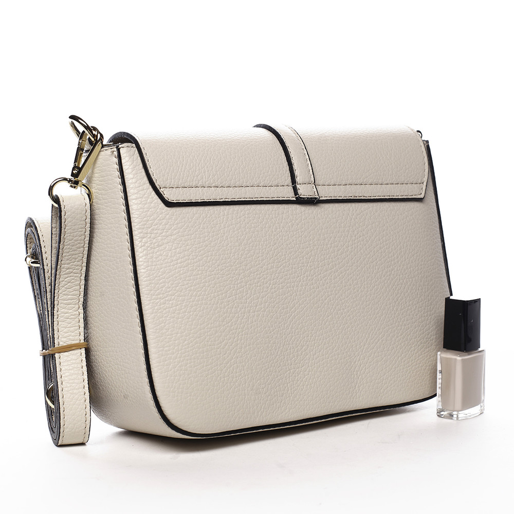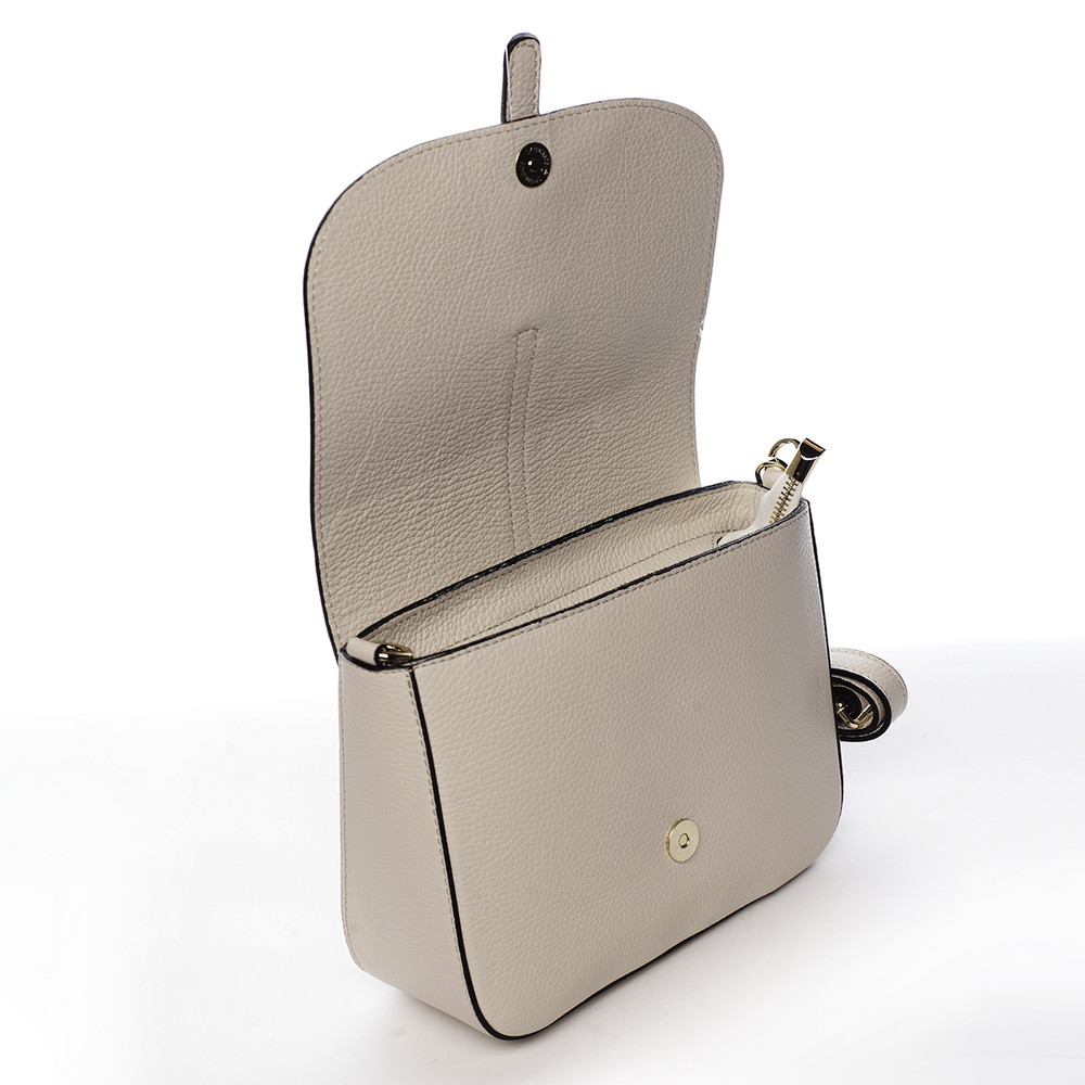 Chybí Vám jiskra, potřebujete elegantně a vkusně oživit svůj outfit do města, do společnosti nebo na párty? Máme pro Vás zimní nabídku kožených crossbody kabelek, se kterými svůj styl rozhodně neminete! Značka ItalY vytvořila pevnou crossbody kabelku, která je menších rozměrů a béžové barvy. Novinka. Objednejte ještě dnes a vyzkoušejte, vrátit ji můžete až za 30 dnů! Klopu, které dodává na originalitě zlatá spona, otevíráme magnetickým cvokem, pod ní je hlavní kapsa na zip. Vnitřní prostor Vám bude stačit na osobní věci jako je telefon, klíče, kosmetika, peněženka a podobné potřeby.